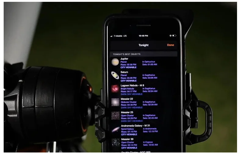 Приложение StarSense Explorer автоматически генерирует список видимых в настоящее время объектов. Посмотрите на планеты, более яркие туманности и галактики, звездные скопления и двойные звезды из города. Или Возьмите телескоп в Темное Небо, чтобы увидеть слабые, глубокие небесные предметы.