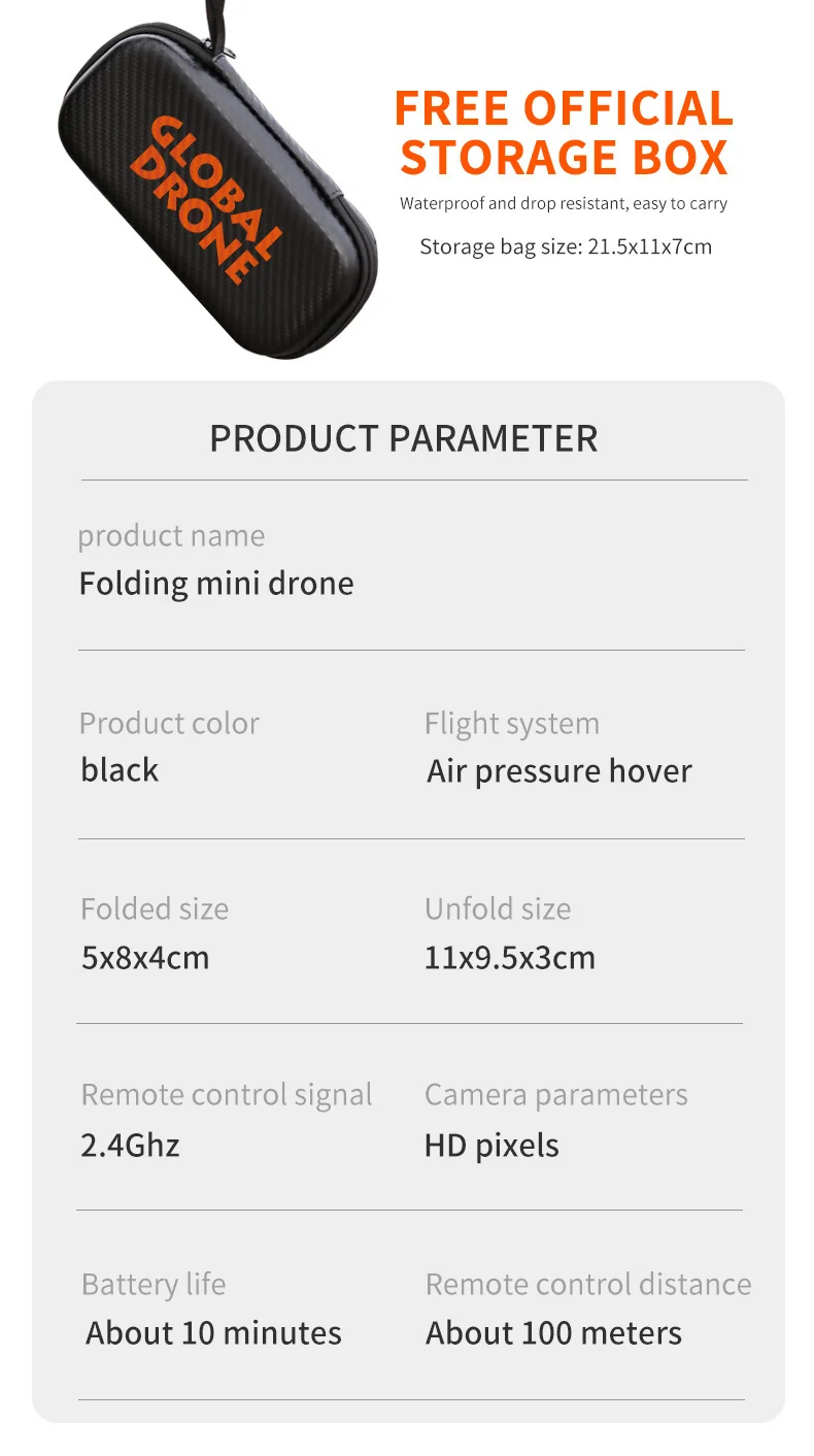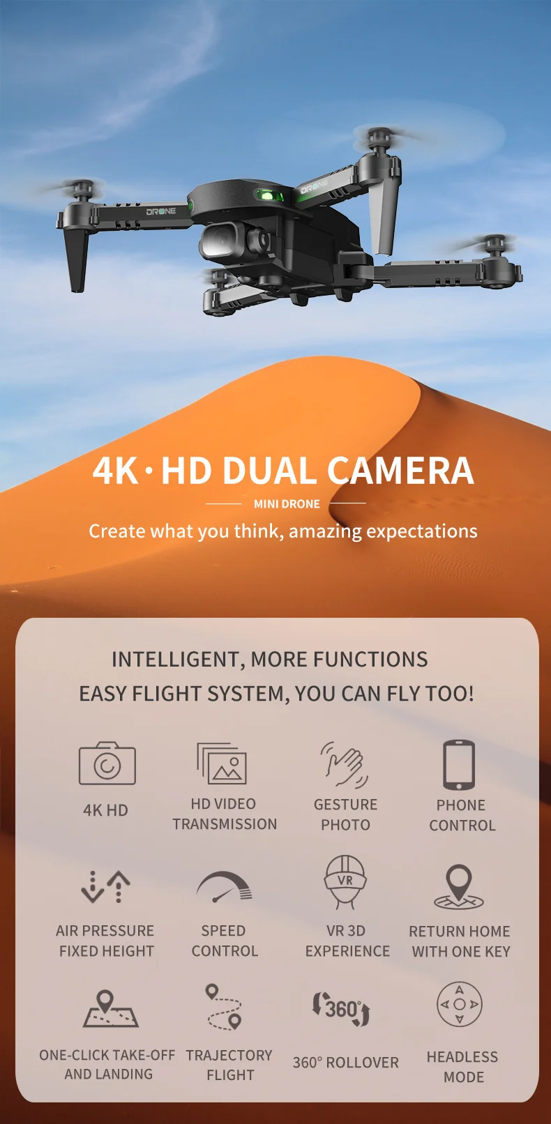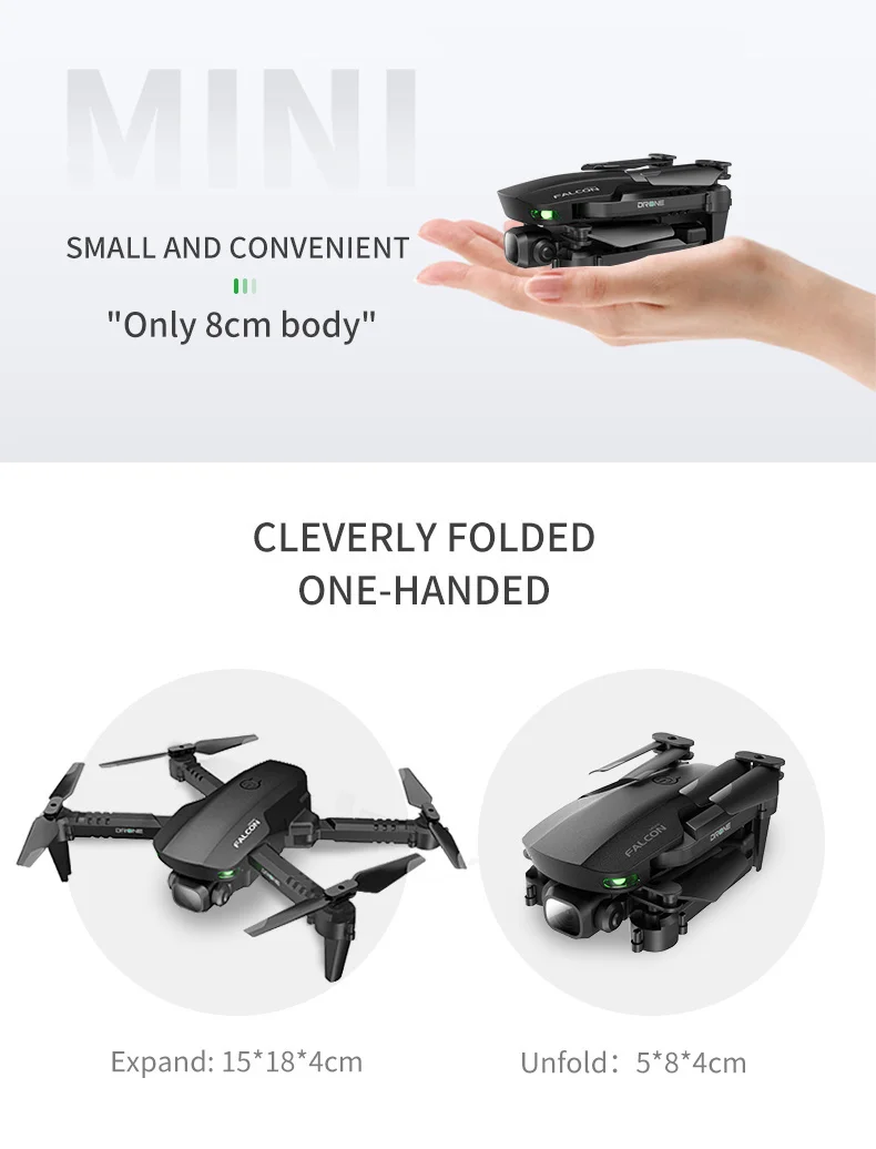 Функции s: вверх/вниз, вперед/назад, влево/вправо, боковой полет, светодиодный свет, режим Безголового движения, автоматическое возвращение с одной клавишей, режим удержания высоты, wiFi FPV (двойной объектив с двойной функцией переключения объектива)