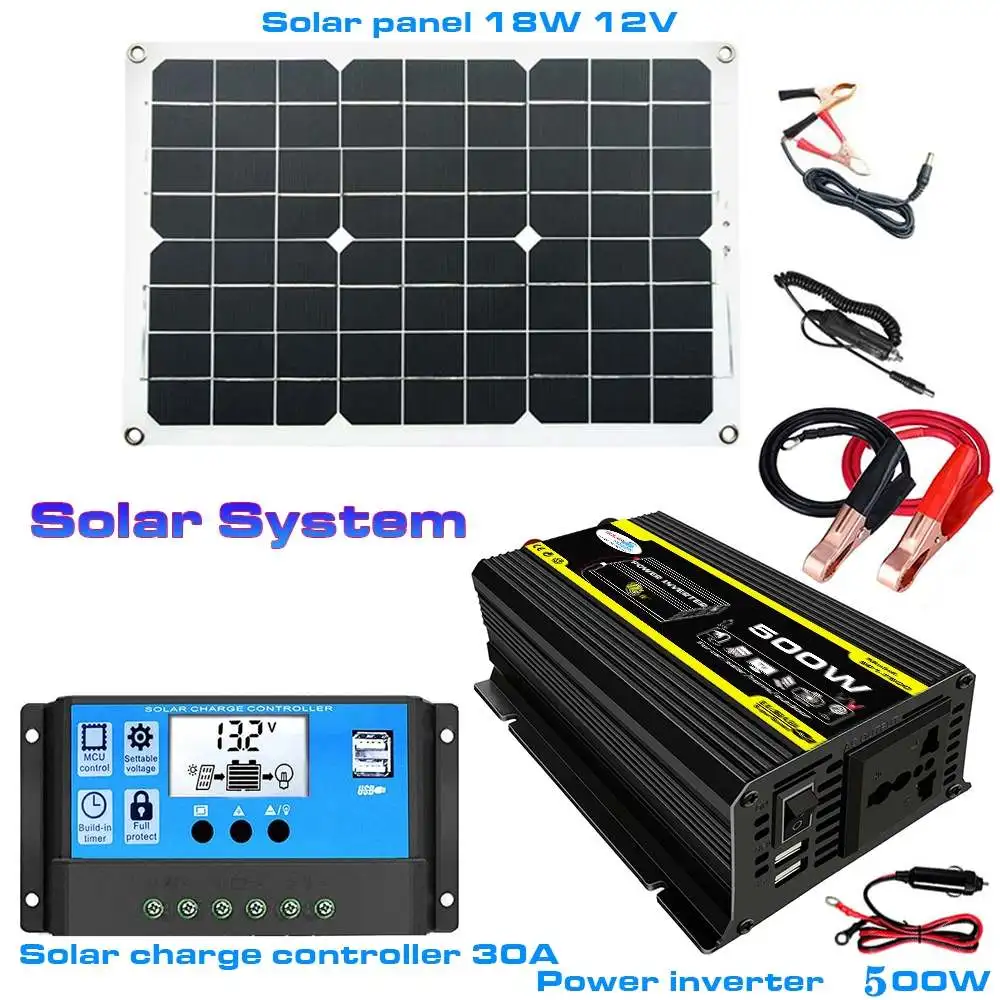 Система генерации солнечной энергии, 2 USB, 18 Вт, солнечная панель + инвертор мощности 500 Вт, постоянный ток 12 В в переменный ток 220 В + 30 А, контроллер солнечного заряда, комплект солнечной системы