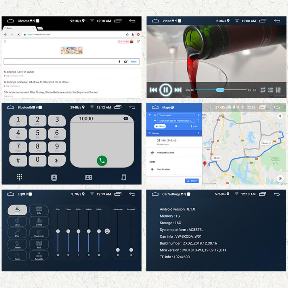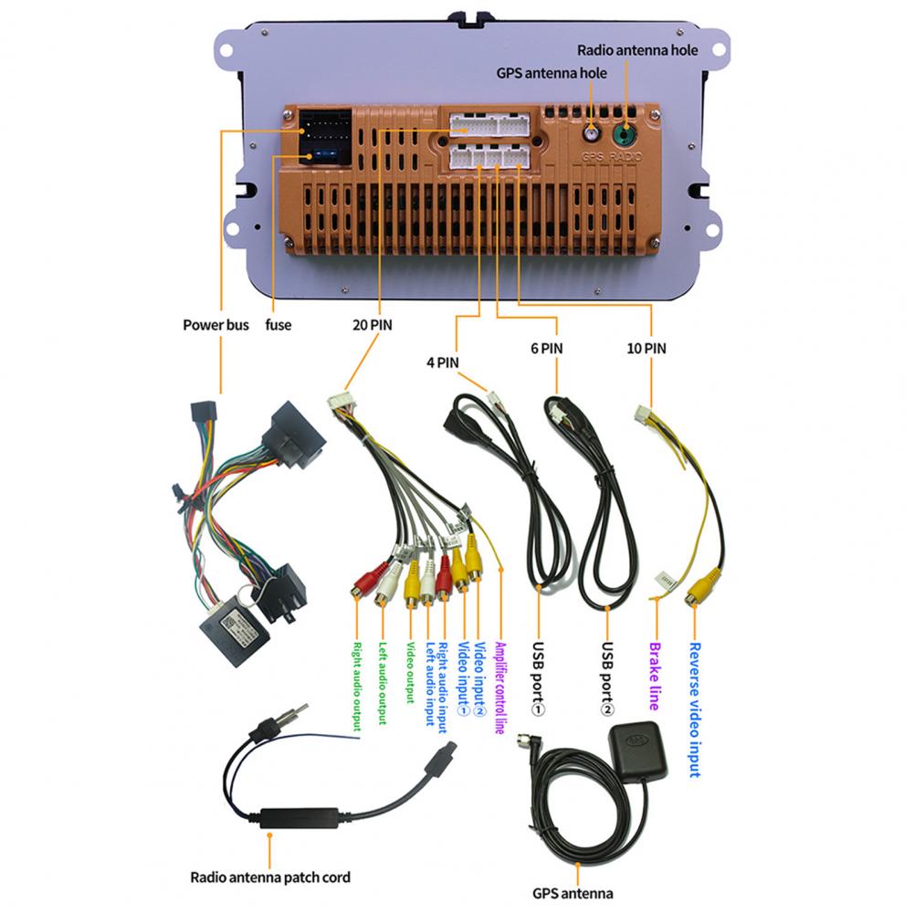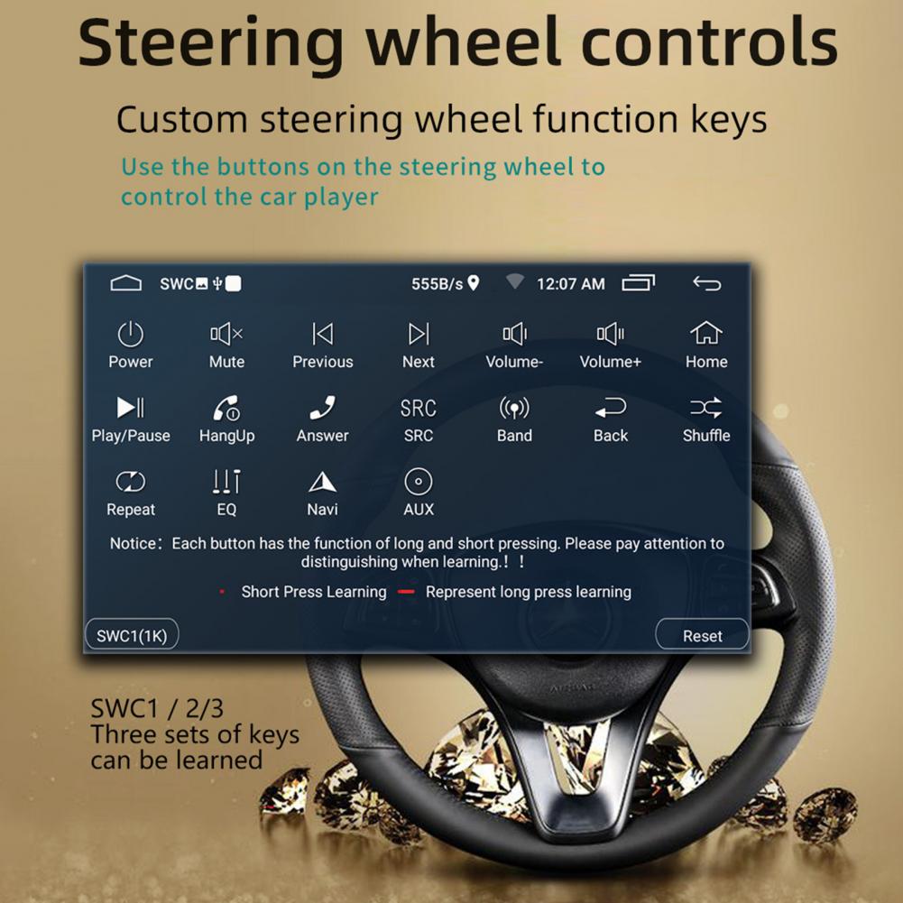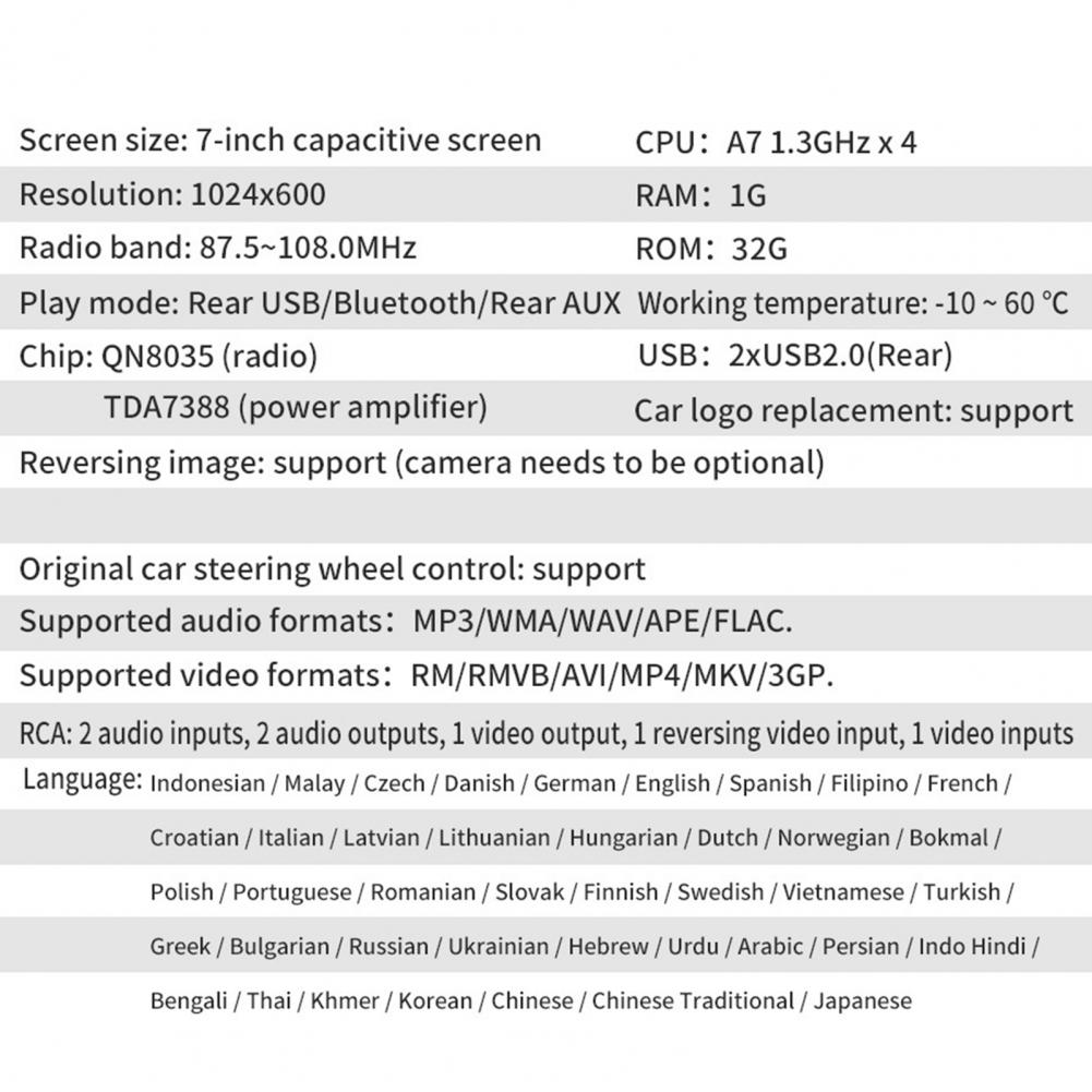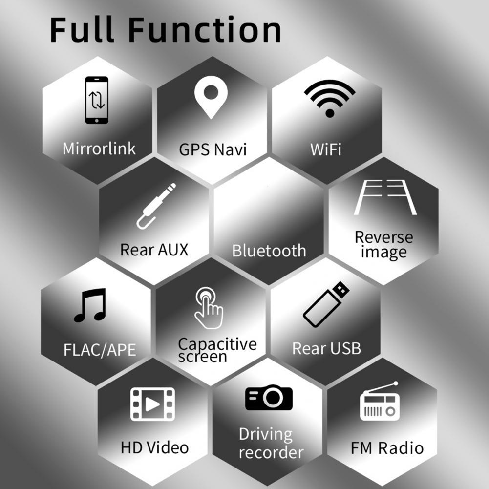 В продукт входят несколько функций, таких как функция радио FM, чтение u-диска (аудио/видео/картинка), функция AUX, функция Bluetooth, аудиовыход RCA (который может быть соединен с сабвуфером), функция заднего вида (необходимо купить камеру самостоятельно), видеовход, оригинальная функция обучения рулевого колеса автомобиля, Установка рекордера для Android, подключение WIFI, gps-навигация, зеркальная ссылка (для Android/для Apple) и установка приложения.