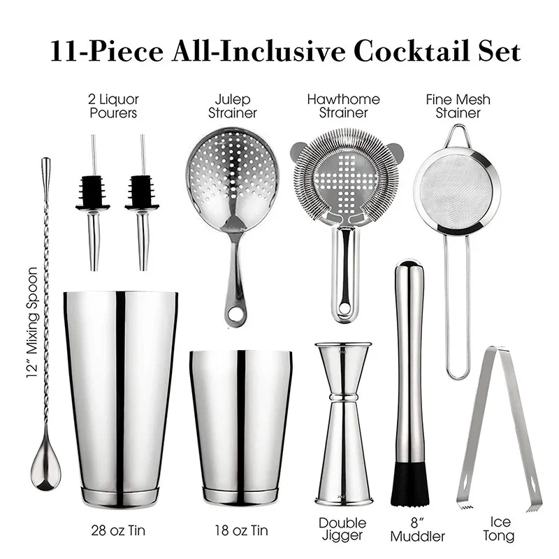【 Набор шейкеров для коктейлей 11 шт. Этот набор включает в себя Бостонский Шейкер Набор чашек, ледяной Тонг, Hawthorne ситечко, muddler, двухсторонний мерный стаканчик, ложка для смешивания, сетчатый ситечко, ситечко julep и 2 отверстия. В нем есть все необходимое для бара, чтобы сделать себе отличные напитки.
