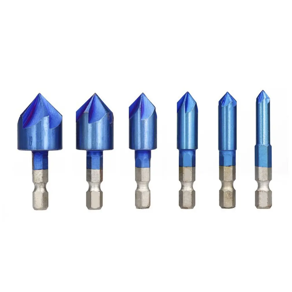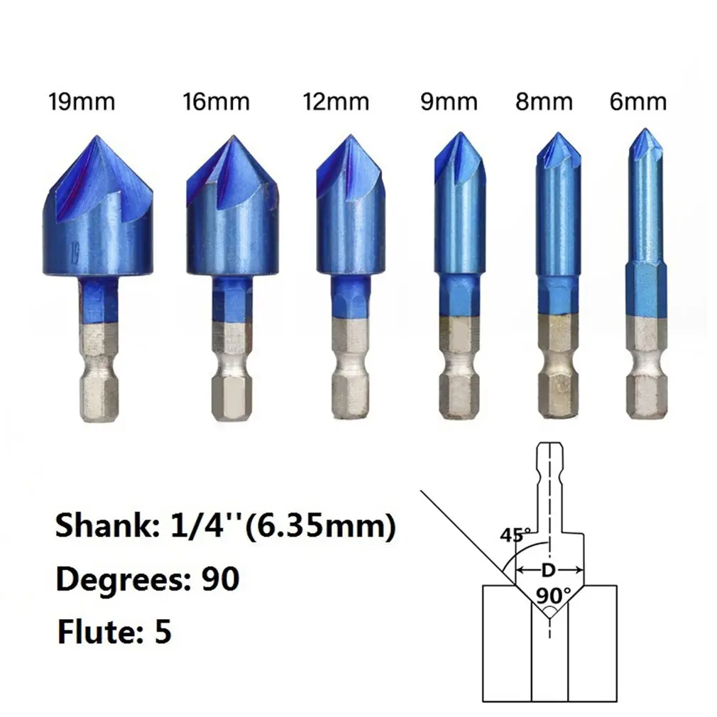 Набор из 6 предметов с синим покрытием, 90 градусов, пятиклиновой инструмент для снятия фаски с шестигранной ручкой, 6-19 мм