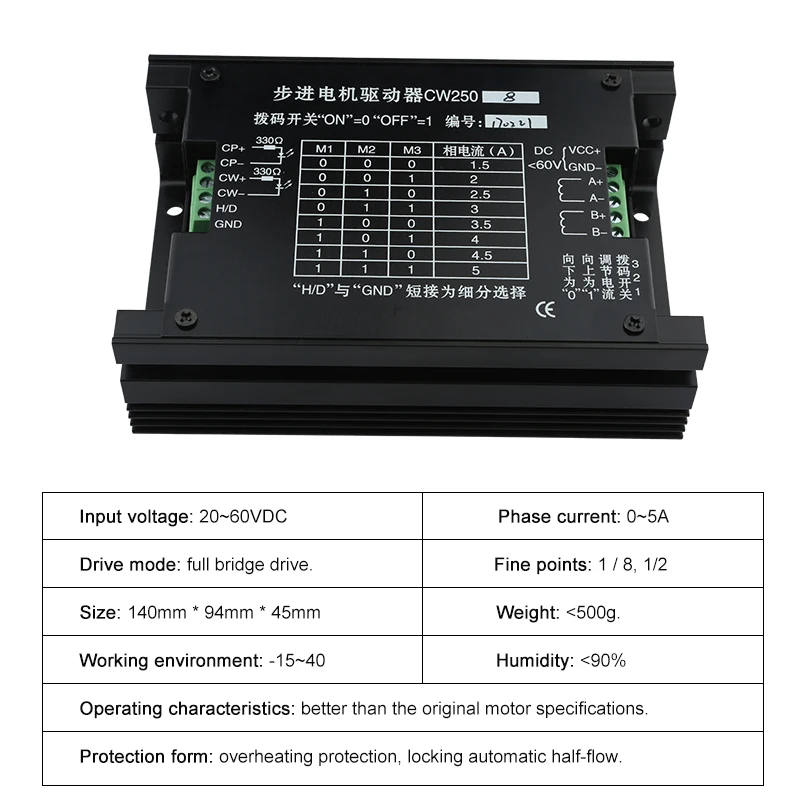 Напряжение драйвера составляет 20 В-60 В постоянного тока, что подходит для двухфазных гибридных шаговых двигателей различных типов с током ниже 5.0а. Существует 16 типов микроступенчатых подделок (максимальное количество подделок-51200 шагов/оборотов); Максимальный диапазон рабочего тока-1,2a-5,0a, выходной ток-8 уровней; он имеет автоматические функции защиты от полутоков, самопроверки, перенапряжения и низкого напряжения, такие как напряжение и перегрузки по току.