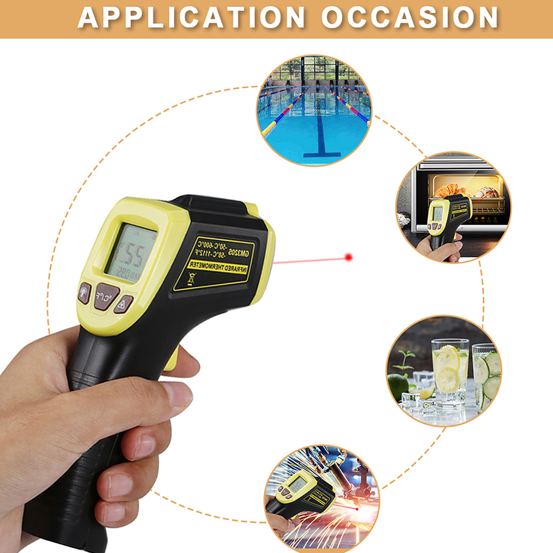 Этот продукт используется для измерения температуры поверхности следующих объектов: трубы горячей воды, горячие части двигателей, кухонные поверхности, тепловые трубы и изоляционные материалы, электрические соединения, светильник, балласты... и т. Д.