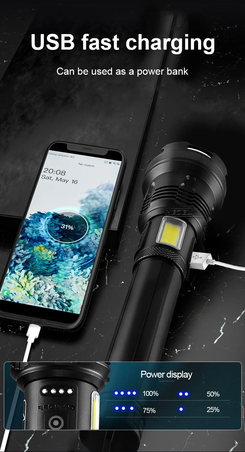 • Фонарик может использоваться в качестве мобильного источника питания. Это важный продукт для кемпинга и путешествий.