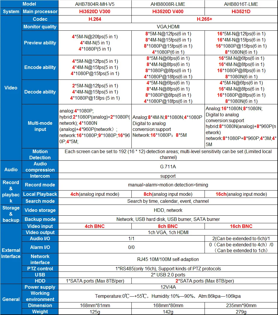 Support VGA, HDMI full HD output simultaneously;Support ONVIF; access third party;Support multiple cloud technology, network penetration, alarm information pushed to your phone and other functions;Support web, CMS, center platform management software XMEYE;Support various mobile Nmonitoring (iPhone, Android);Remote Access, With DNS(ARSP),easy to monitor remotelySupport UTC, control signal&video stream transmit through one single coaxialSupportAHD/TVI/CVI/CVBS/IP five signals;Support XVI,image quality is better;8CH:SupportH.265+encoding, ultra-low bitrates, compatible with H.264 surroundings;Support VGA, HDMI full HD output simultaneously;Support ONVIF; access third party;Support multiple cloud technology, network penetration, alarm information pushed to your phone and other functions;Support web, CMS, center platform management software XMEYE;Support various mobile monitoring (iPhone, Android);Remote Access, With DNS (ARSP),easy to monitor remotelySupport UTC, control signal& video stream transmit through one single coaxialSupportXVI/AHD/TVI/CVI/CVBS/IP six signals;Support Digital to analog conversion.Instant playback16CH:SupportH.265+encoding, ultra-low bitrates, compatible with H.264 surroundings;Support VGA, HDMI full HD output simultaneously;Support ONVIF; access third party;Support multiple cloud technology, network penetration, alarm information pushed to your phone and other functions;Support web, CMS, center platform management software XMEYE;Support various mobile monitoring (iPhone, Android);Remote Access, With DNS (ARSP),easy to monitor remotelySupport UTC, control signal& video stream transmit through one single coaxialSupportXVI/AHD/TVI/CVI/CVBS/IP six signals;Support intelligent analysis: functions like Perimeter alert.item retention.Video diagnosis.intelligent fast play and intelligent retrieval;