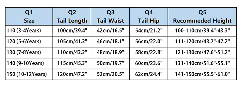 Качественная ткань обладает высокой эластичностью для комфортного ношения, вы можете выбрать размер в соответствии с ростом ребенка. Например, если рост вашего ребенка 131-140 см, вы можете выбрать размер 140. Q1 = размер Q2 = длина хвоста Q3 = талия хвоста Q4 = бедра хвоста Q5 = Рекомендуемая высота