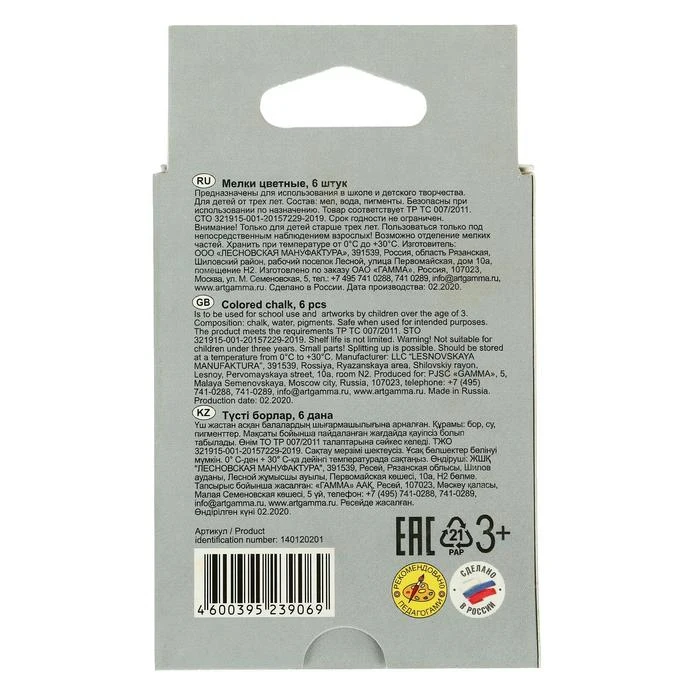 Страна производства Россия Сертификат ЕАЭС N RU Д-RU.ГА05.В.05061/19 Европодвес (да/нет) Да Количество цветов 6.0 Возраст ребенка (значения справочника) От 3 лет Штрихкод на единице товара (да/нет) Да Количество товара в наборе 6 Форма мела КвадратныйЗаказывала данные наушники для себя,очень довольна этим товаром. Пользуюсь уже больше месяца и нареканий к ним за это время... Читать отзыв полностью...