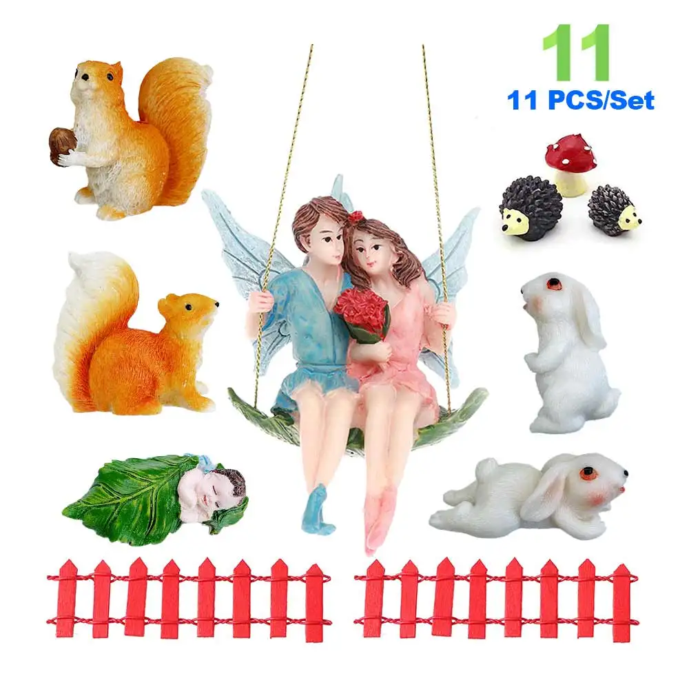 В couple fair swing garden kit вы найдете 11 штук, в том числе 1 шт. пара fair статуэтки, 2 шт. белки, 2 шт. кролики, 1 набор ежик и гриб украшение (3 шт.), 2 шт. заборы (красный), 1 предмет; Одежда для сна; Детская фея
