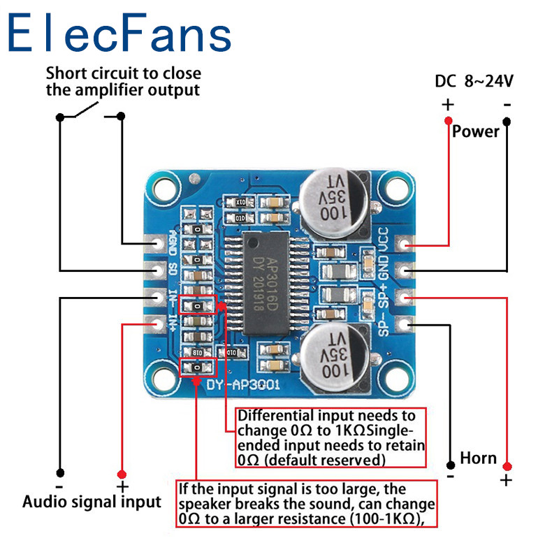 Источник питания не превышает 12 В при подключении к динамику 4Ω, а источник питания не превышает 24 В при подключении к динамику 8 Ом. Рекомендуется использовать номинальную мощность динамика при 30 Вт или выше, чтобы избежать горения динамика, И кабель динамика не должен быть слишком длинным, чтобы убедиться, что он подходит в пределах 1 метра.