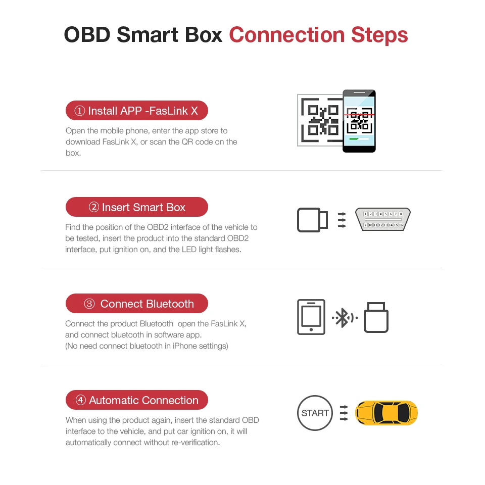 При повторном использовании продукта вставьте стандартный интерфейс OBD2 в транспортное средство и установите автомобильное зажигание, оно автоматически подключится без повторной проверки.