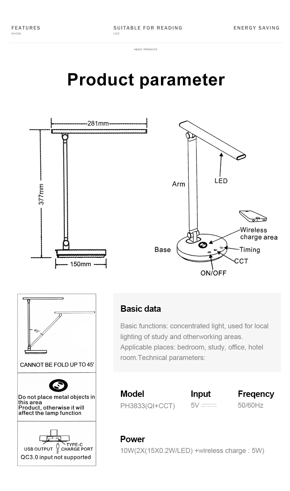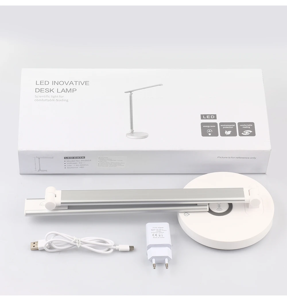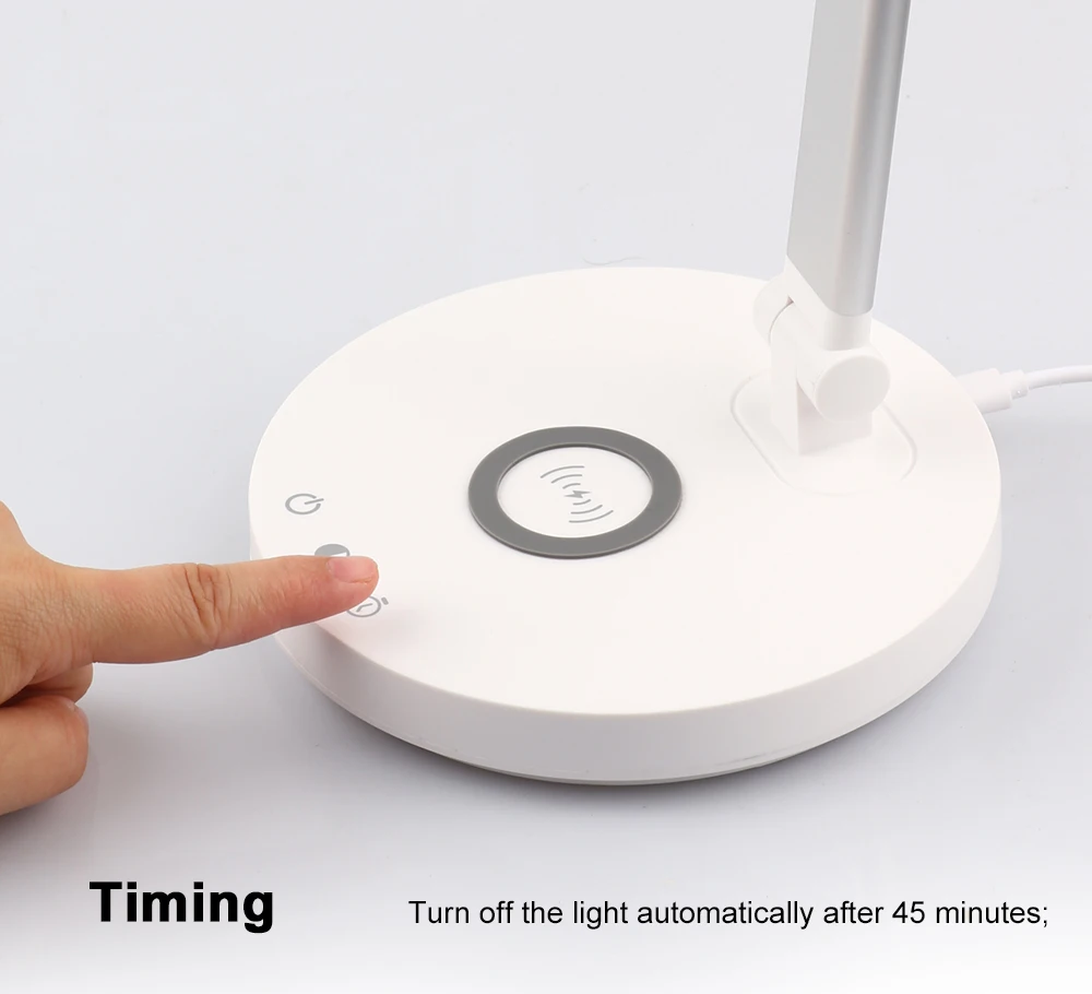 1. Тип разъема: штепсельная вилка европейского стандарта/штепсельная Вилка USB 2. Затемнение: Да 3. Напряжение: DC5V 4. ВАТТ: 10 Вт 4. Цвет корпуса: белый 5. Источник: светодиодный светильник 6. Материал: алюминий, железо, пластик 7. Особенности продукта: современная простота, гибкий/сенсорный 8. Применение: читальный зал, офис. Спальня, гостиная. 9. Цветовая температура: натуральный белый, холодный белый, теплый белый. 10. Функция: сенсорное управление затемнением, беспроводная зарядка. Набор времени 45 минут.