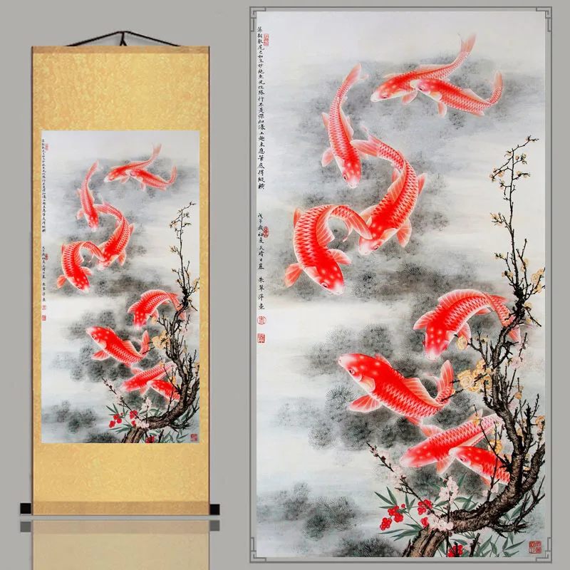 Благоприятная шелковая картина руйи девять рыб, простая прокрутка, каллиграфия и живопись каждый год, есть больше, чем Новогодняя картина рыбы, нав, роспись, подарок