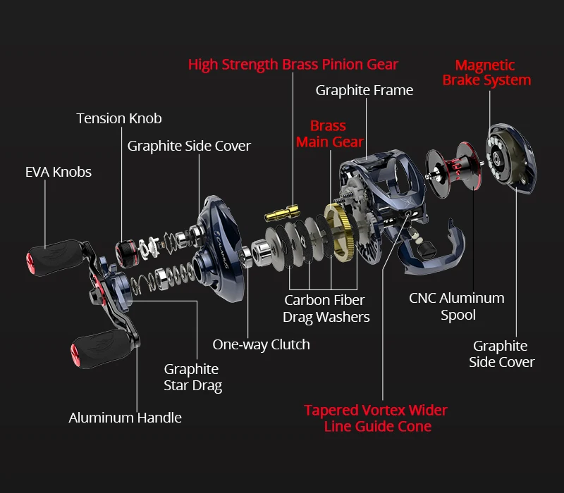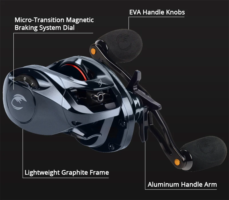Превосходные компоненты-Катушки с литьевыми катушками из алюминия с ЧПУ, светильник кие графитовые боковые крышки и рамки, Удлиненная ручка 4-1/3 дюйма (106 мм) и удобные ручки из ЭВА. Шарикоподшипники из нержавеющей стали с двойным экранированием 5 + 1 позволяют работать в пресной или соленой воде.