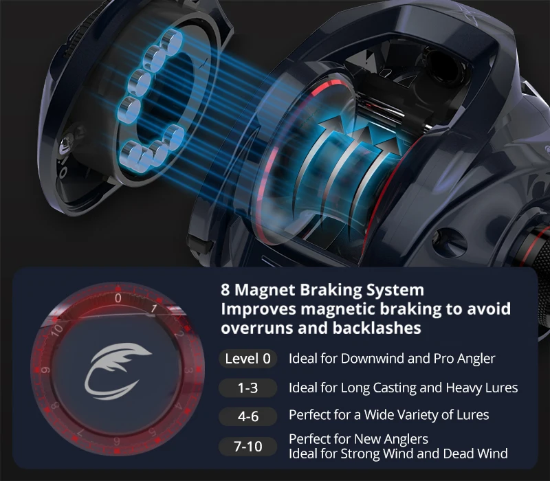 8 Магнитная Тормозная системаУлучшает магнитное торможение, чтобы избежать переливов и люфтовУровень 0 идеально подходит для любителей рыболововУровень 1-3 идеально подходит для длительного заброса и тяжелых приманокУровень 4-6 идеально подходит для самых разных приманокУровень 7-10 идеально подходит для новых рыболовов. Идеально подходит для сильного ветра и мертвого ветра