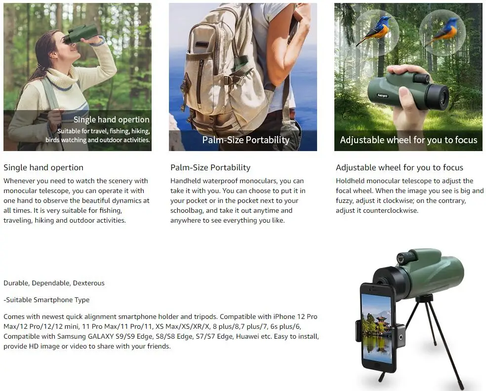 🌟【Latest оптика Technology: Этот монокулярный телескоп оснащен BAK4 Призма FMC зеленой мультипросветление с каждой стороны, это будет предоставляем каких-либо гарантий в Улучшенный светильник передачу и яркость и светильник с высоким коэффициентом пропускания достигает до 99.5%. Наш монокуляр имеет низкий светильник ночного видения, он может помочь вам увидеть вещи в низкий светильник, обеспечивая вам удивительный опыт просмотра.