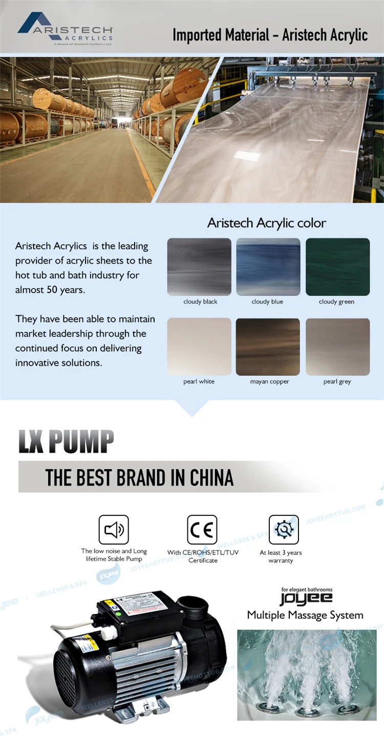 Наша Ванна изготовлена из 4 мм чистого акрила, рамы из нержавеющей стали и выбрать «LX» насос, который с сертификатом CE, UL и SAA. Каждая ванна должна пройти проверку воды 24 часа без протекания. Затем посылка.
