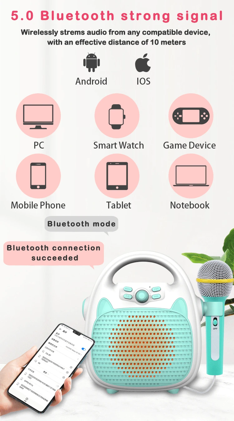 【Режим Bluetooth 】Этот режим караоке-игрушки Bluetooth может воспроизводить популярные песни на мобильных телефонах! Простые в использовании кнопки (вкл/выкл, воспроизведение/пауза, Предыдущая/следующая песня, светодиодный, громкость, Bluetooth) Возьмите микрофон и пусть ваш талант просвечивает!
