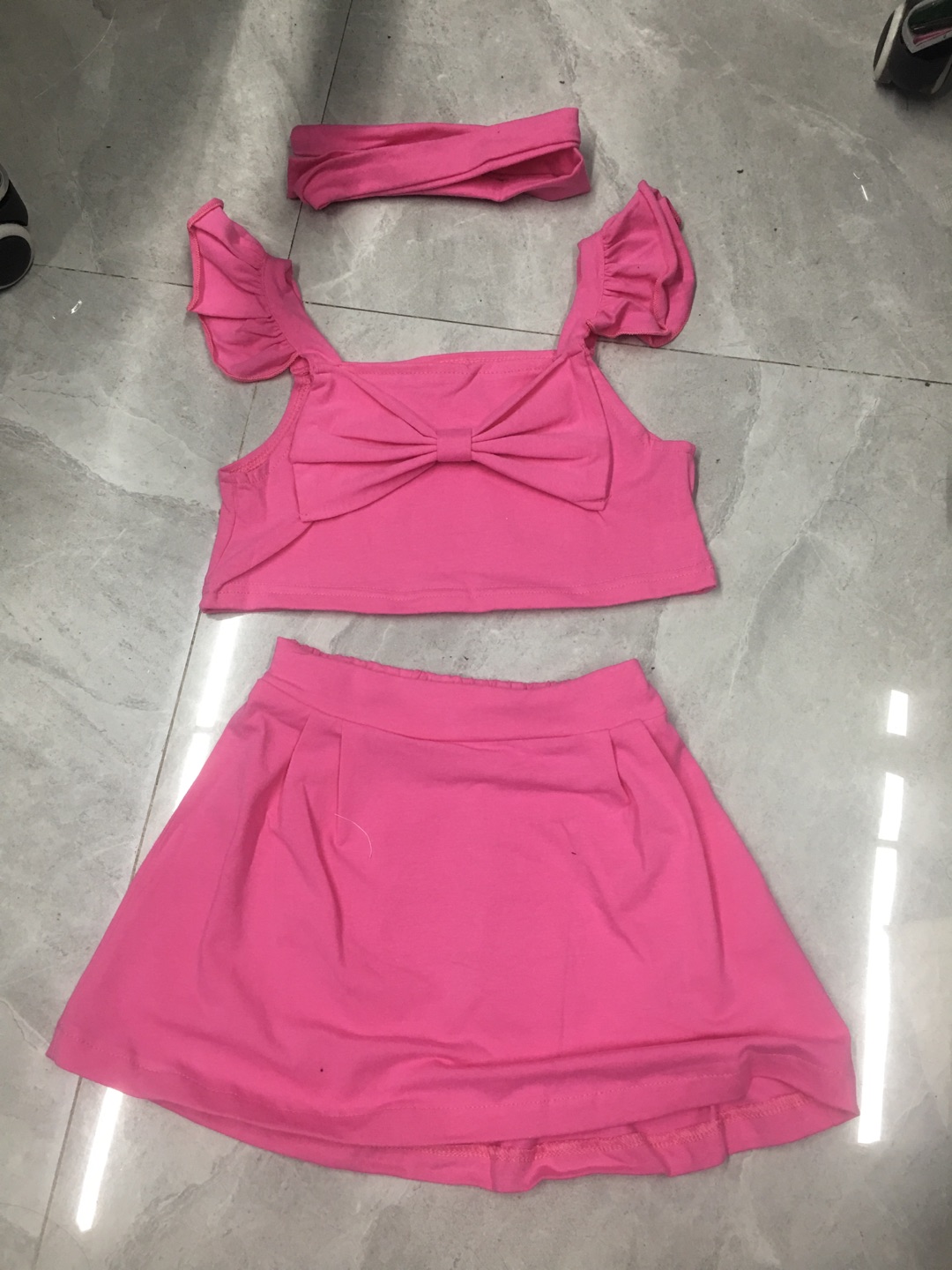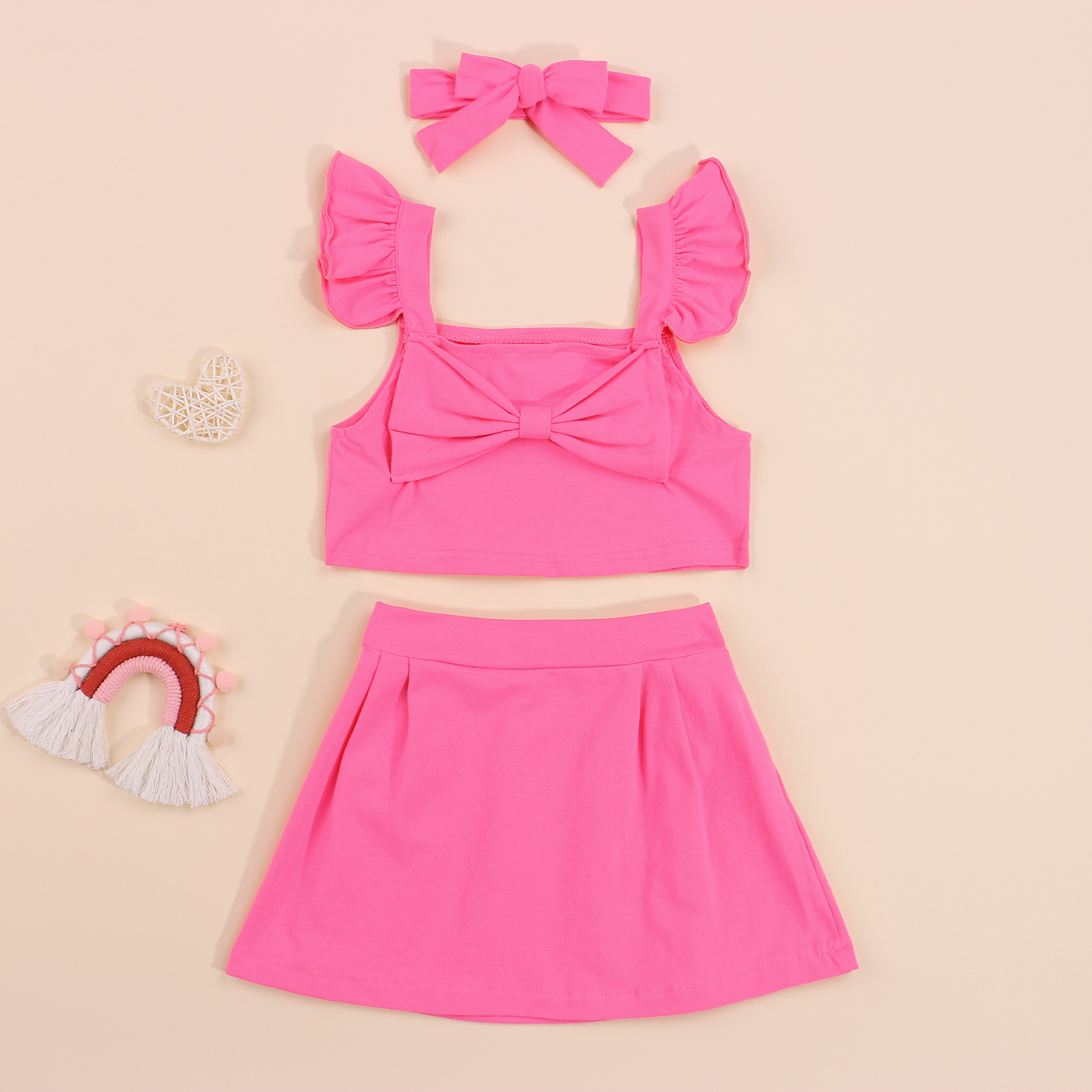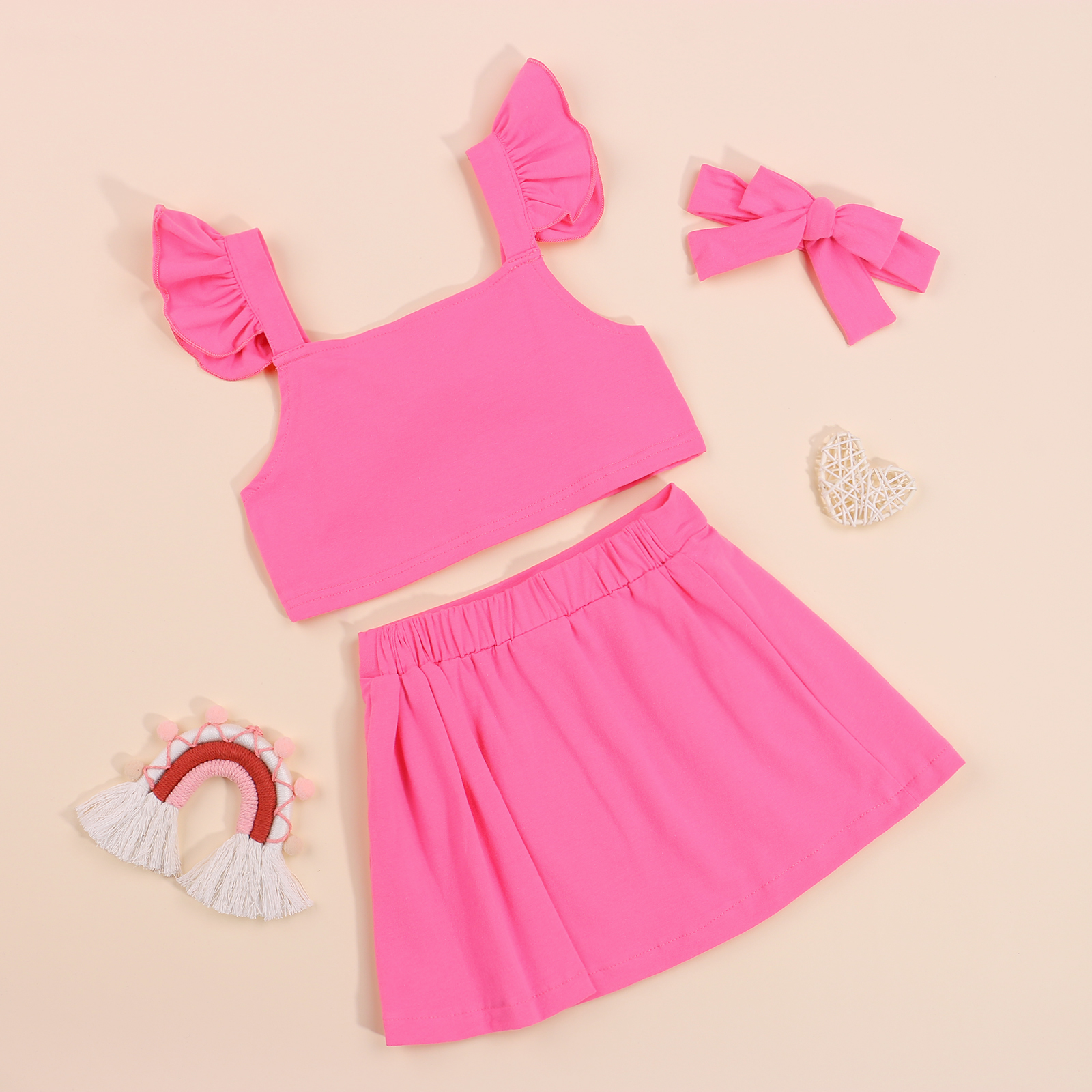 Розовые однотонные топы с квадратным воротником и рукавами-крылышками, короткая юбка и головной убор, делают ваших детей милыми и стильными.