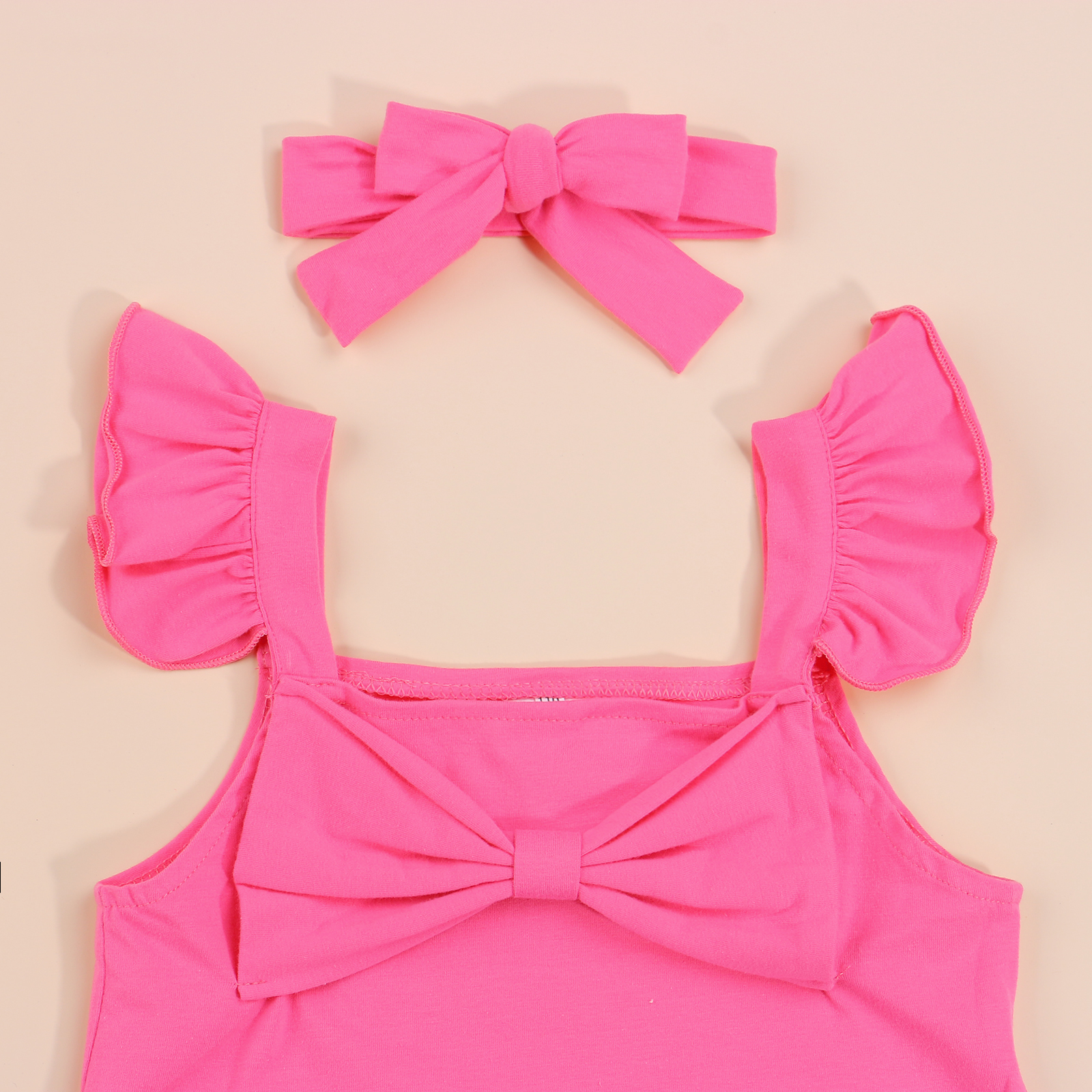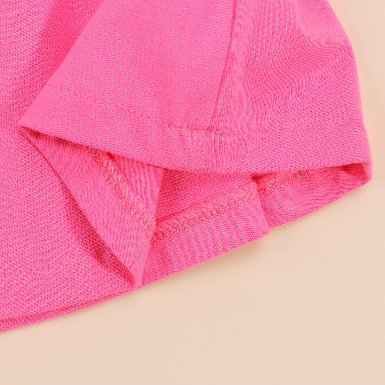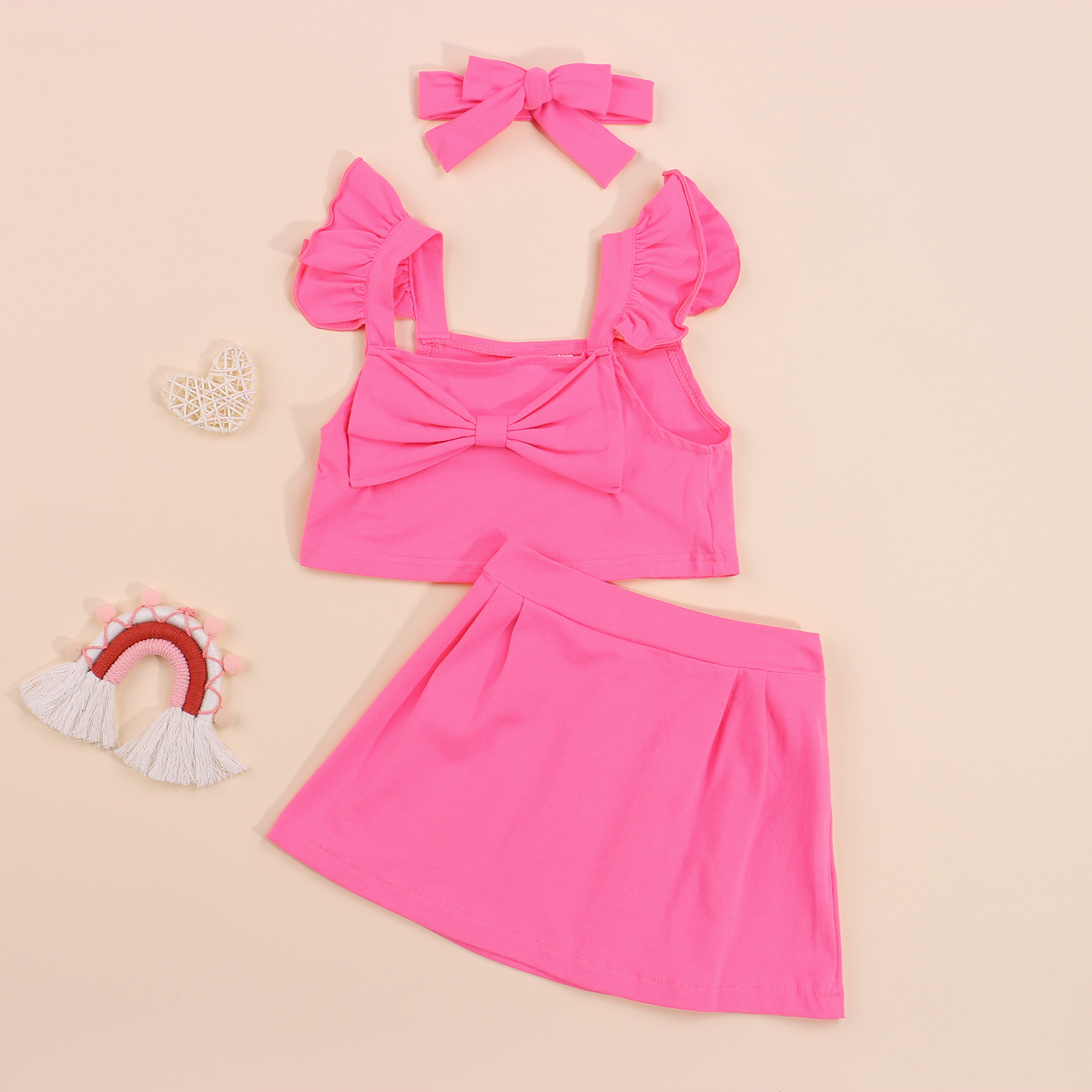 Розовые однотонные топы с квадратным воротником и рукавами-крылышками, короткая юбка и головной убор, делают ваших детей милыми и стильными.