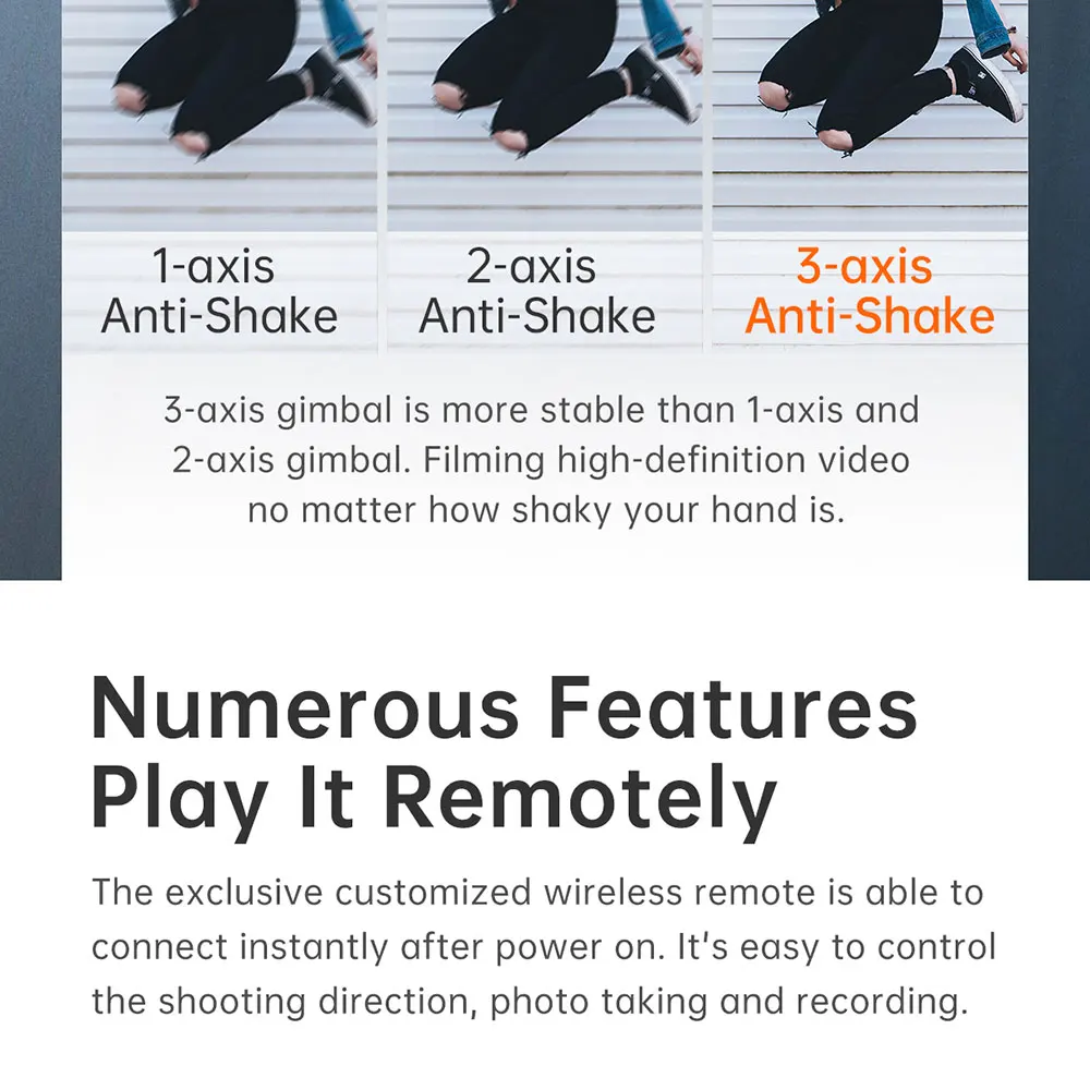 Эксклюзивный индивидуальный беспроводной пульт дистанционного управления может быть подключен сразу после включения. Вы можете легко управлять направлением съемки, делать снимки и записывать в любом месте.