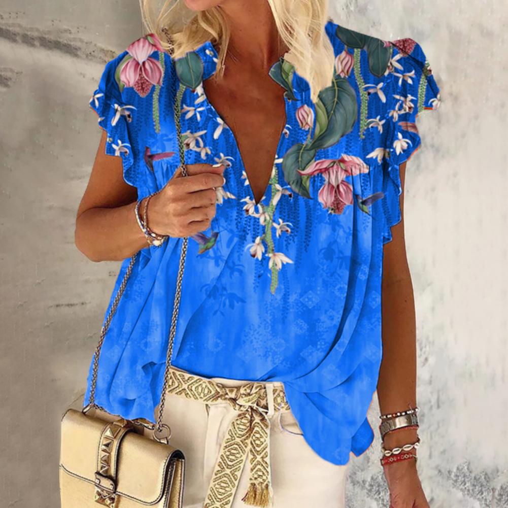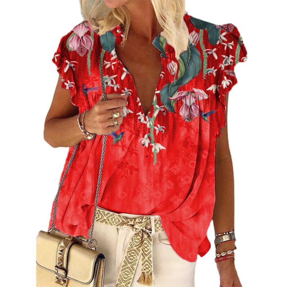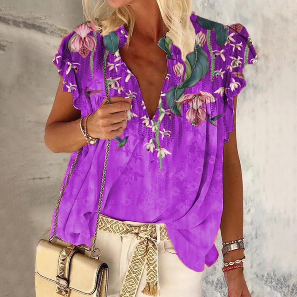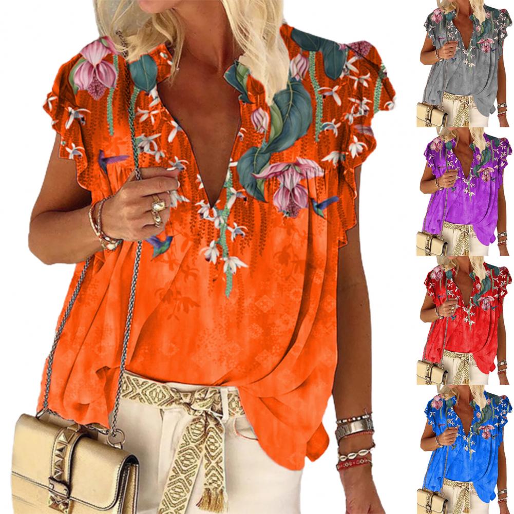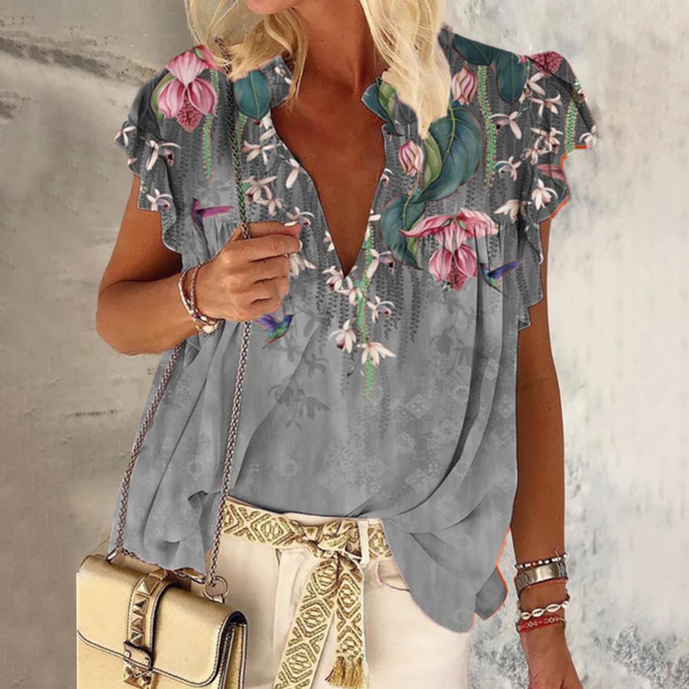 Повседневная и стильная свободная футболка с цветочным принтом, короткими рукавами и v-образным вырезом.