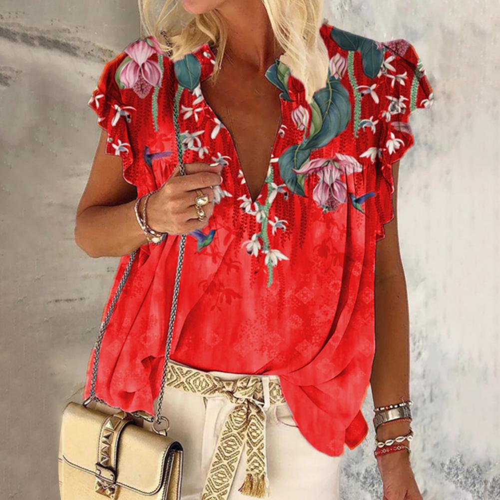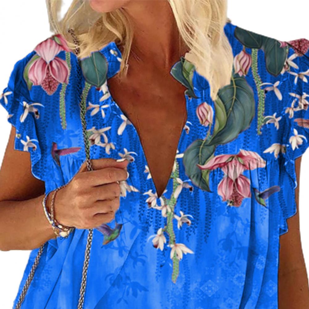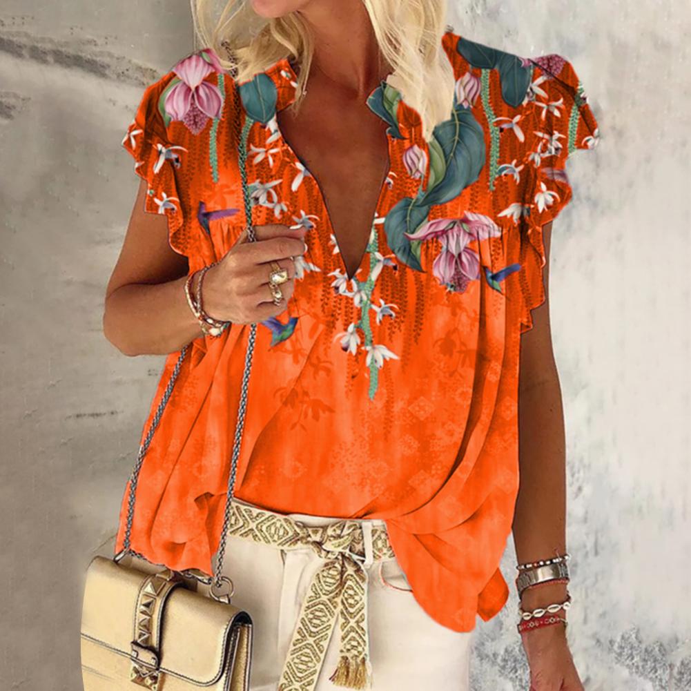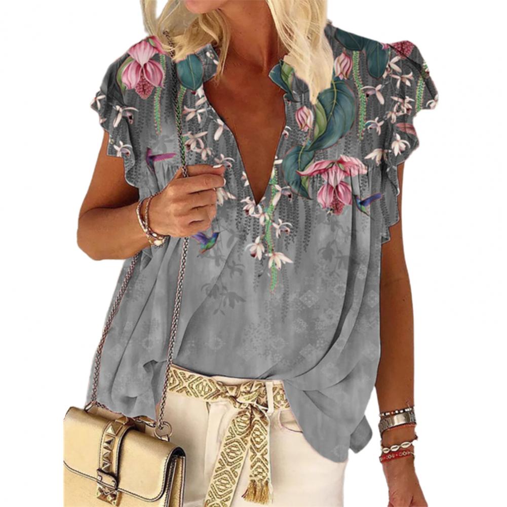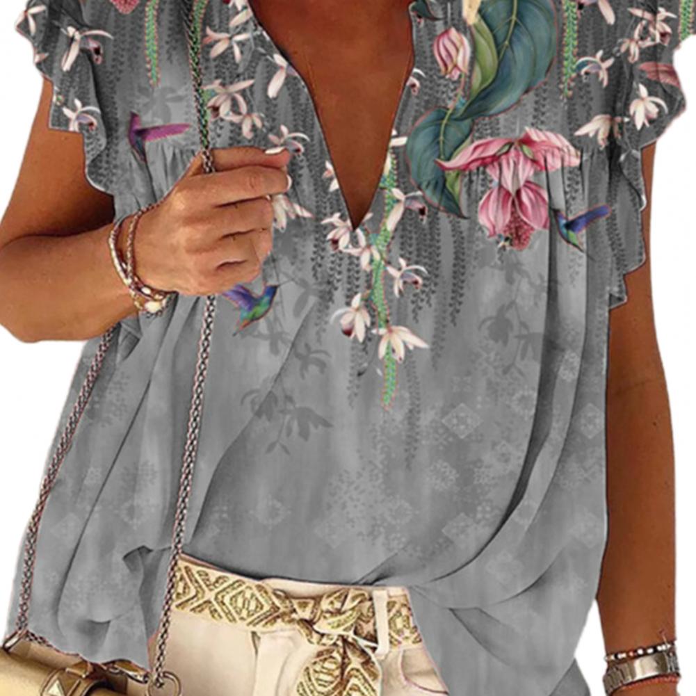 Повседневная и стильная свободная футболка с цветочным принтом, короткими рукавами и v-образным вырезом.
