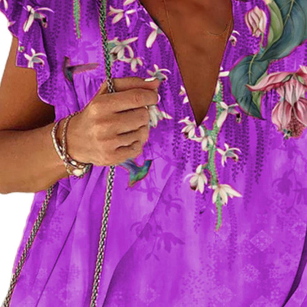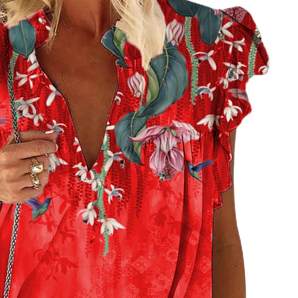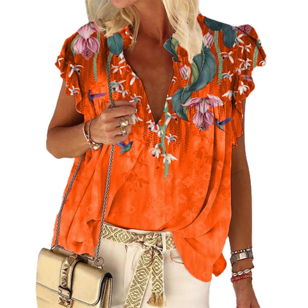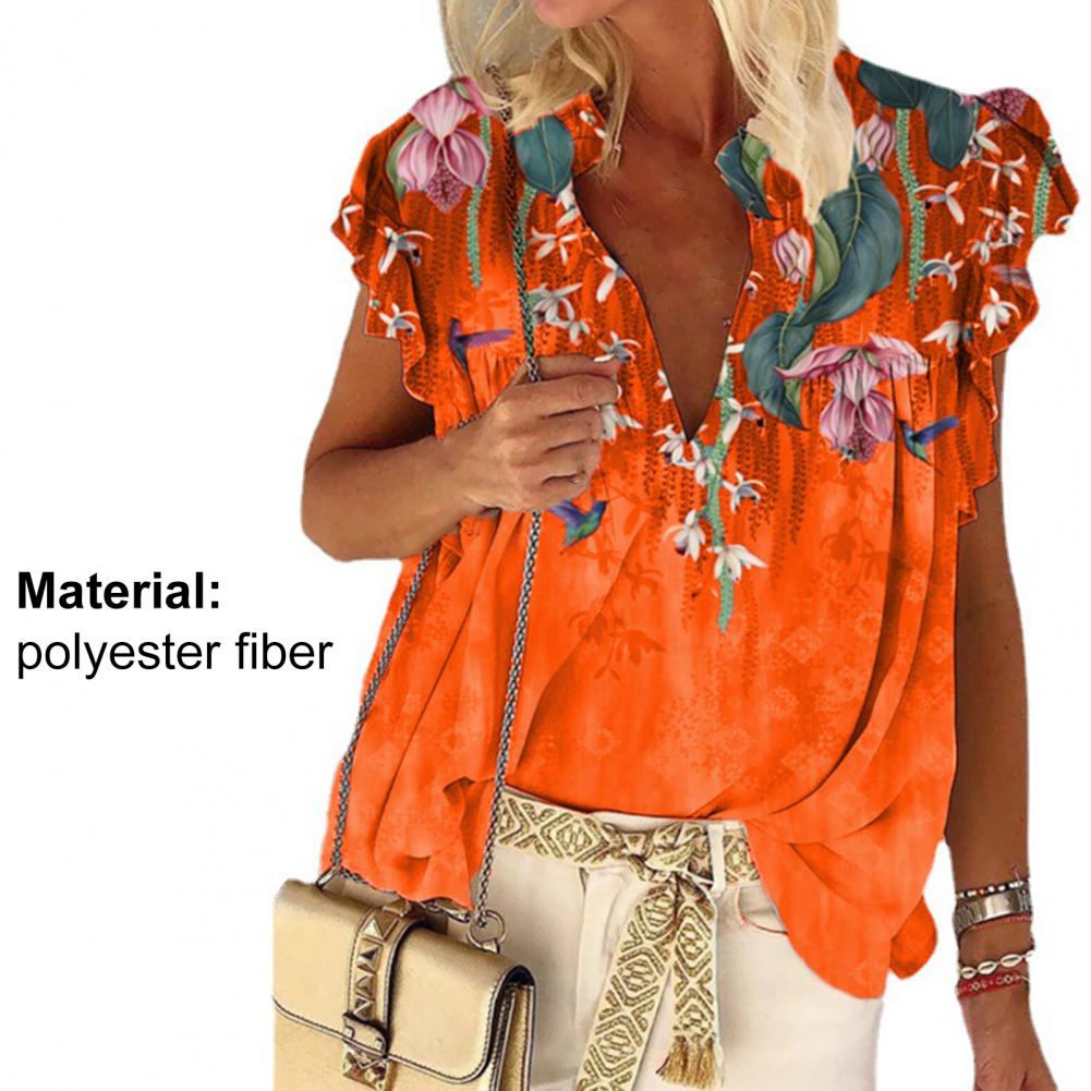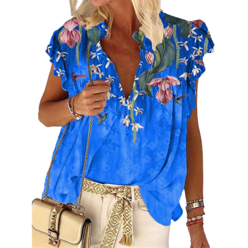 Повседневная и стильная свободная футболка с цветочным принтом, короткими рукавами и v-образным вырезом.