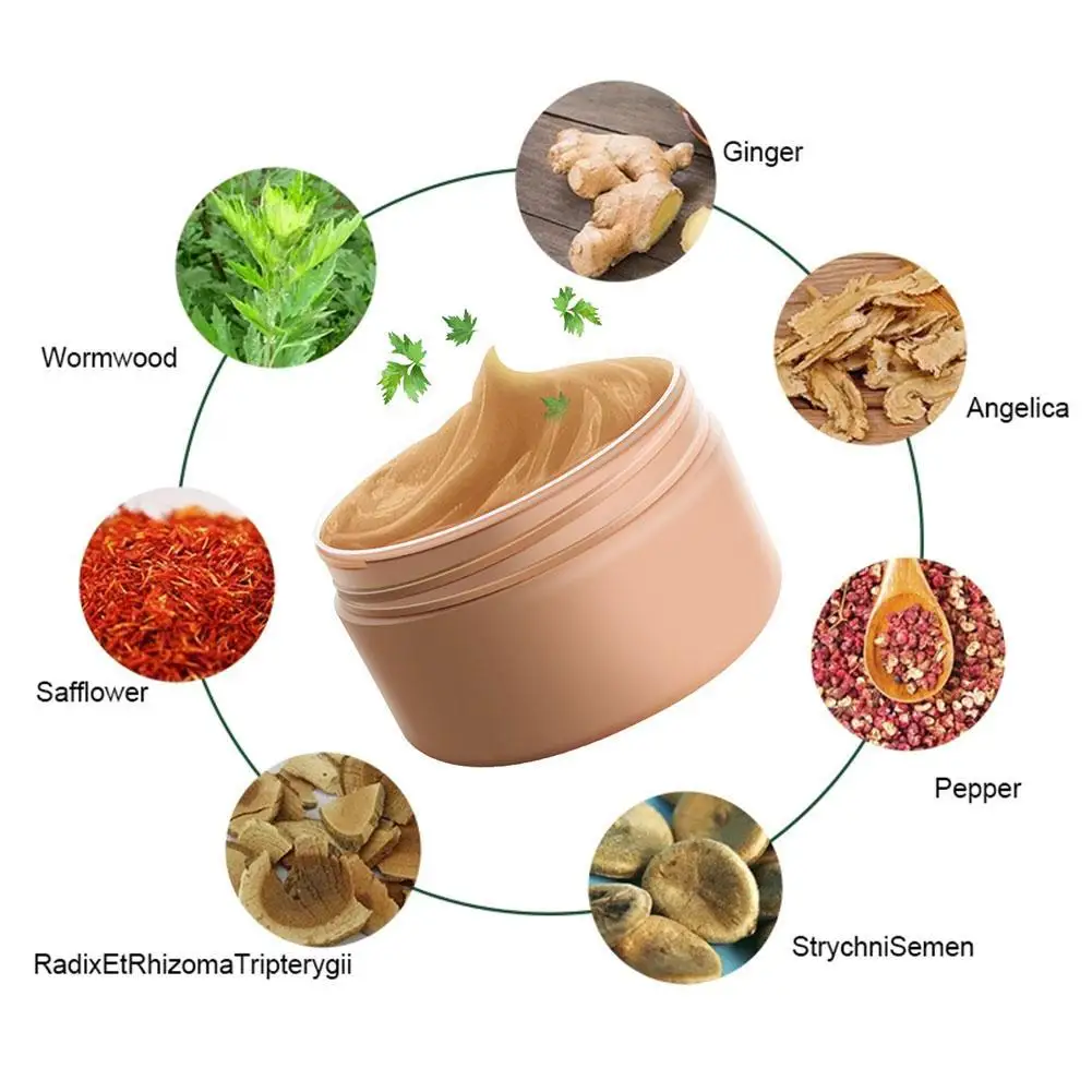 The product consists of wormwood, ginger, tripterygium, pepper, Sichuan monkshood, horse money seeds, angelica, safflower, cetyl alcohol, stearic acid, petrolatum, white oil, black snake, recreational scorpion, scorpion, gecko, frankincense , Myrrh is made from notoginseng, borneol, borneol, camphor, triethanolamine, and methylparaben as raw materials, processed and packaged.