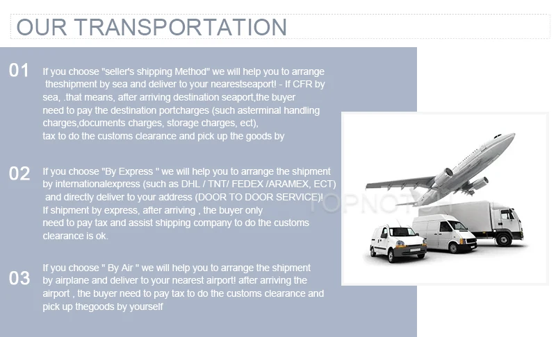3.-Если вы выбираете «экспресс», мы поможем вам организовать доставку международной экспресс-почтой (например, DHL / TNT/ FEDEX /ARAMEX и т. Д.) И непосредственно доставляем по вашему адресу (от двери до двери)! При отправке экспресс-почтой, после прибытия, Покупатель должен только оплатить налог и помочь транспортной компании, чтобы сделать таможенное оформление в порядке.(ZEYU)