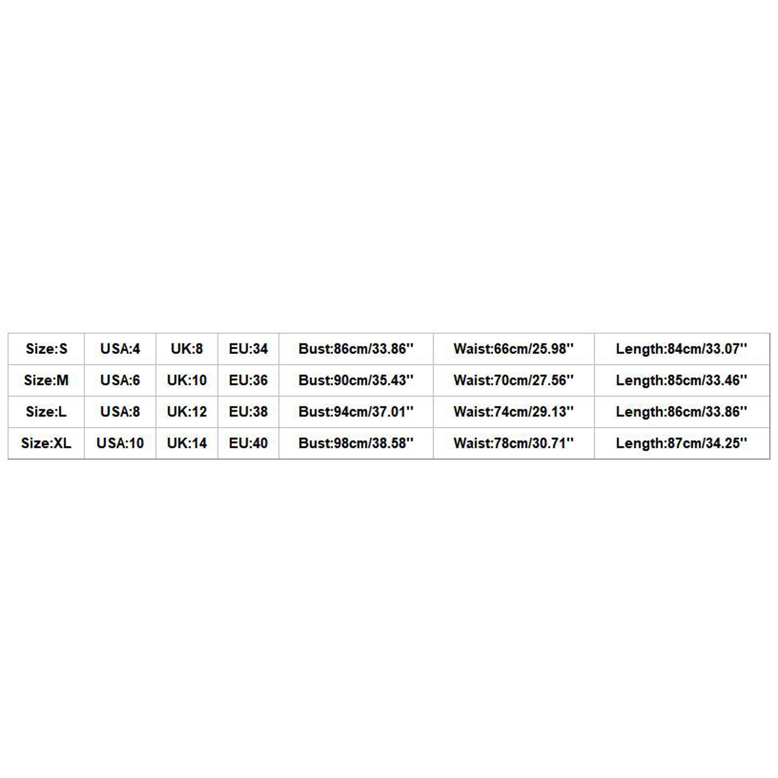 Размеры США Великобритания ЕС Бюст Талия Длина S 4. 8 34 86 см/33,86'' 66 см/25,98'' 84 см/33,07'' М 6 10 36 90 см/35,43'' 70 см/27,56'' 85 см/33,46'' L 8 12 38 94 см/37,01'' 74 см/29,13'' 86 см/33,86'' XL 10 14 40 98 см/38,58'' 78 см/30,71'' 87 см/34,25''