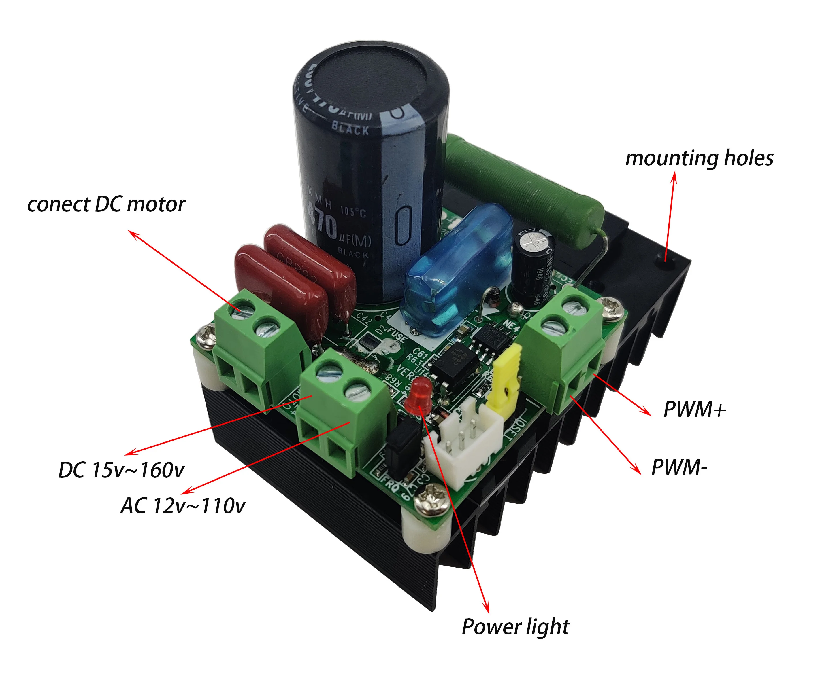 Этот регулятор частоты вращения двигателя может поддерживать вход переменного и постоянного тока. Проблемы с неполярностью питания существуют. Отличное тепло sinkwith монтажные отверстия. И с широким диапазоном крепления двигателя. Он может использоваться для управления большинством двигателей постоянного тока на рынке