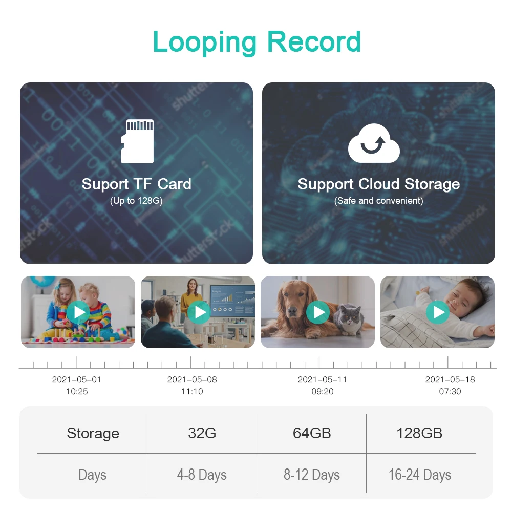 Безопасность и конфиденциальность-это наше главное внимание, зашифрованное Облачное хранилище хранит ваши записи в приватном и безопасном режиме. Есть также слот MicroSD/TF для опций, макс. поддержка 128G. Вы можете хранить в локальном или облачном хранилище. Просто смотрите в реальном времени, записывайте, Воспроизводите свободно, когда и где бы вы ни находились.