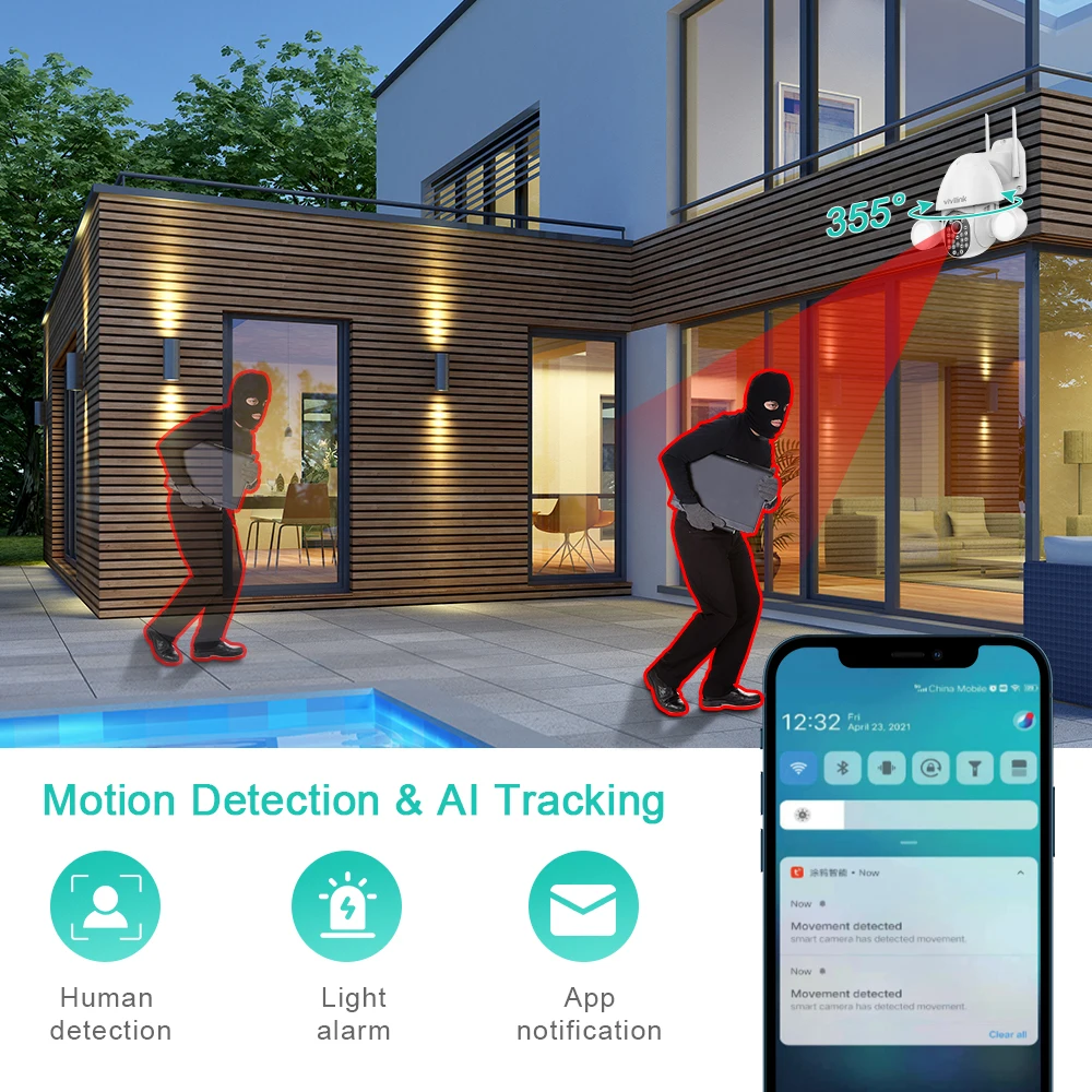PTZ камера оснащена 355 ° панорамирование, 90 ° наклон позволяет контролировать 360 ° Просмотр в приложении, без слепых пятен