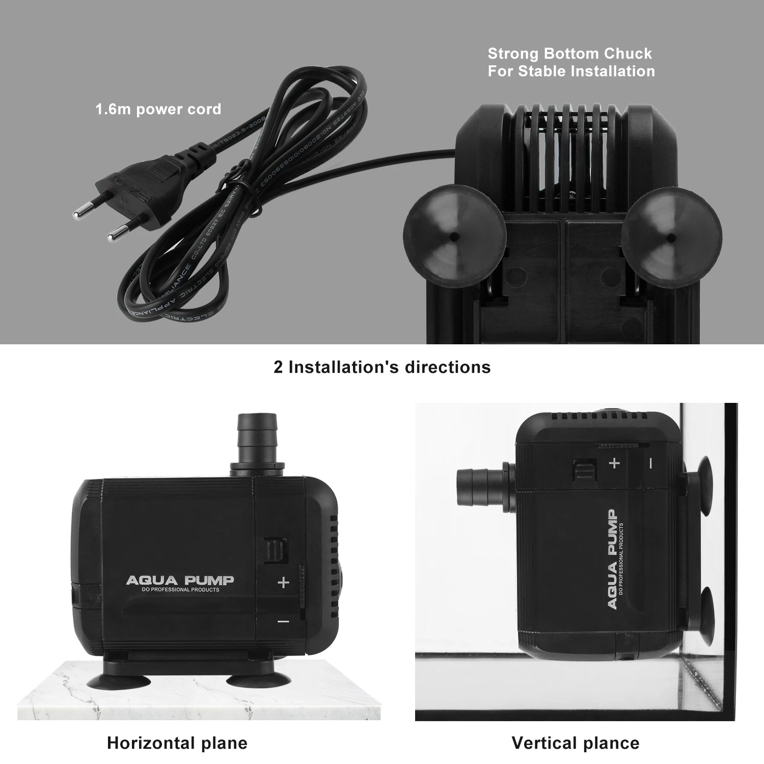 Легкая очистка: водяной насос легко моется. Нет уплотнений или грязных масел. С присосками для вертикального или горизонтального крепления.