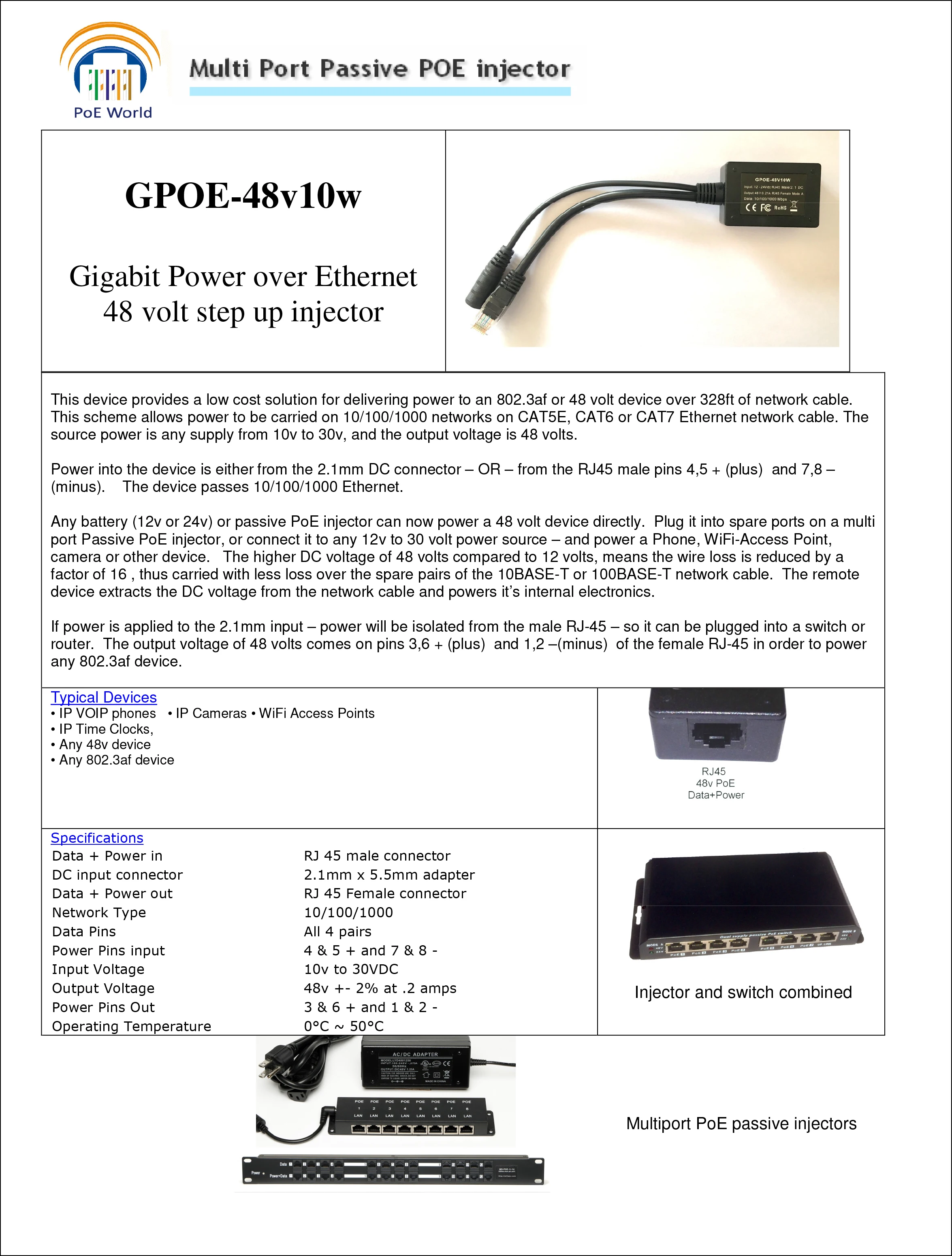This device provides a low cost solution for delivering power to a 802.3af or 48 volt device over 328ft of network cable.