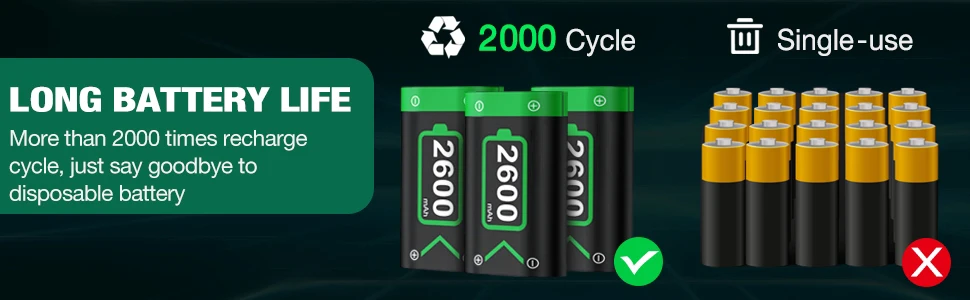 Основание с 4 нескользящими накладками уменьшает износ на контактной поверхности. Ядро батареи защищено алмазной антикоррозийной оболочкой и омолаживающим уплотнительным кольцом, и может быть Перезаряжено 2000 + раз, не беспокойтесь о том, что аккумулятор для контроллера xbox one стареет слишком быстро.