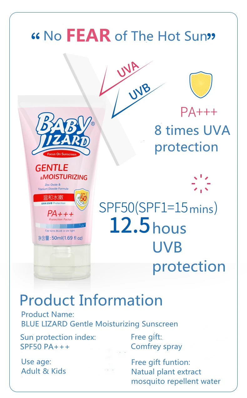 1. Голубая ящерица имеет уникальный патент на «меняющую цвет бутылку», корпус или крышка бутылки изменят цвет при воздействии ультрафиолетового светильник, что поможет вам определить, когда использовать солнцезащитные средства.