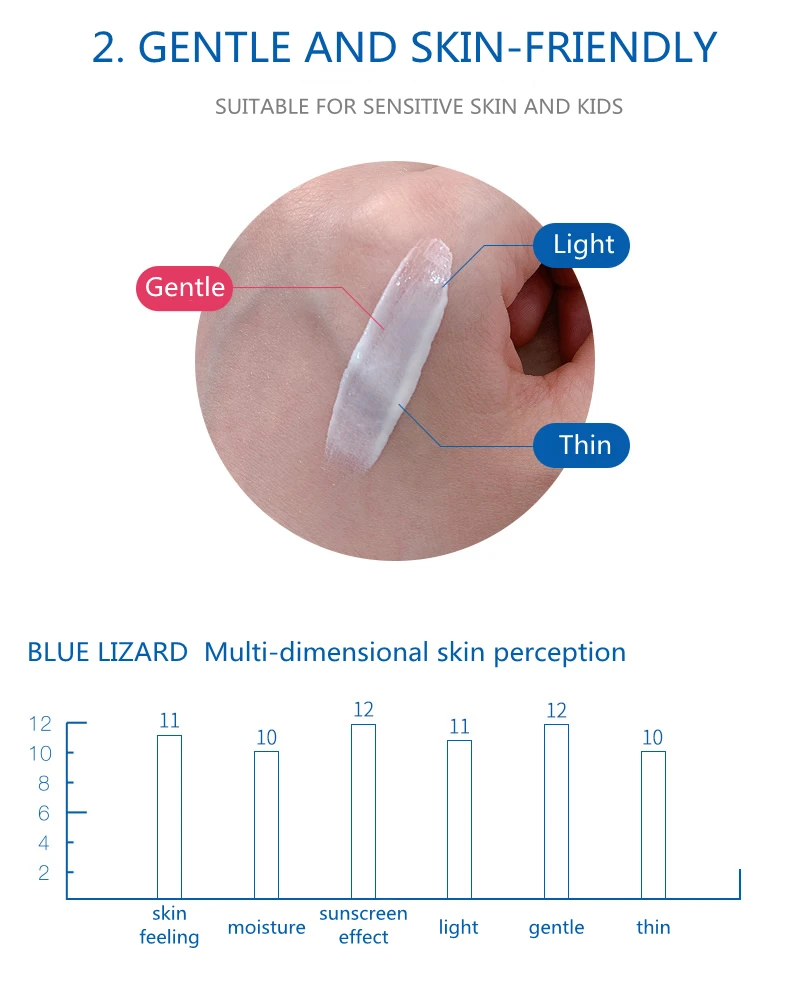 2. Синяя ящерица тщательно выбирает сырье солнцезащитных средств, которые являются мягкими и не раздражают. Являетесь ли вы фанатом спорта на открытом воздухе или чувствительной и хрупкой кожей, синяя ящерица-хороший выбор