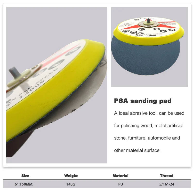 Product Name: 6 Inch PSA Vinyl Backup Sanding PadSpecification: 6" 125mm, 6-hole or non-hole 5/16"-24 thread Features:1) Made of high quality PU which is flexible, durable and environmentally friendly2) Excellent balance of performance, make sanding more smooth and stable. Application: Sander backing pad belongs to Power tool accessories for Polishing & GrindingPackage Included: 1pc sanding pad