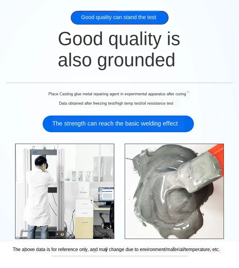 Main Applications: Used for Casting Metal Repair.It Is Made of Epoxy Resin, Curing Agent, Toughening Agent, Reactive Diluent and Various High-quality Materials. It Is Used for Fast Bonding of Metal, Glass, Ceramic, Plastic, Wood, Etc. Used for Bubbles, Pores Or Cracks Filled in Iron and Steel Castings, Casting Defects, High Curing