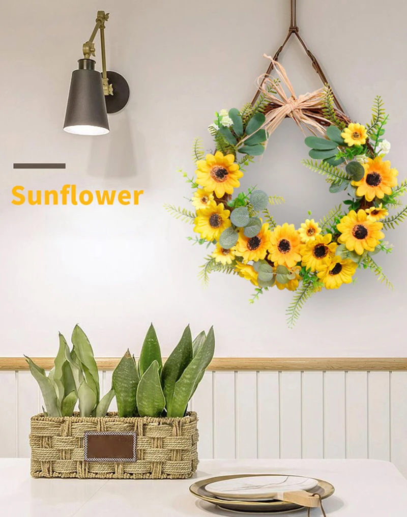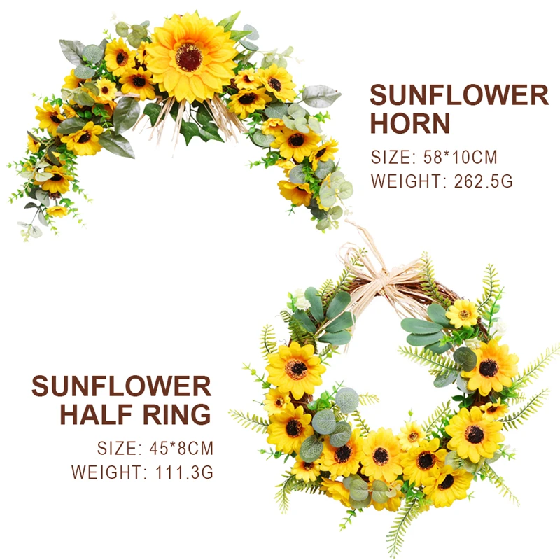 Описание: 1. Экологически чистый материал, без запаха, красивый и изысканный. 2. Этот венок наполнен подсолнухами и листьями, которые подчеркнут Ваш летний/осенний декор. 3. Вы можете повесить его на камин и стену вашей передней двери или гостиной. 4. Подходит для дома, свадьбы, вечерние, фестивальные, делая идеальное украшение. 5. Два стиля: полукруглый венок с подсолнухами и роговой венок с подсолнухами доступны на выбор. 6. Материал: шелковая ткань + кольцо из ротанга 7. Размер: 45*8 см/58*10 см Упаковочный лист: 1 венок
