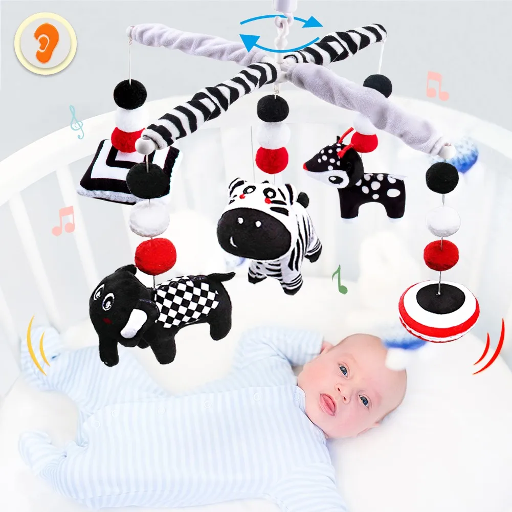Our infant mobile crib Combination of high-contrast animals and shapes (Contains: Round, Square, Elephant, Fawn, Zebra), Experiencing bold black-and-white contrast helps stimulate development in the retina and the optic nerve, which makes this the perfect first toy for infant, developing brains.