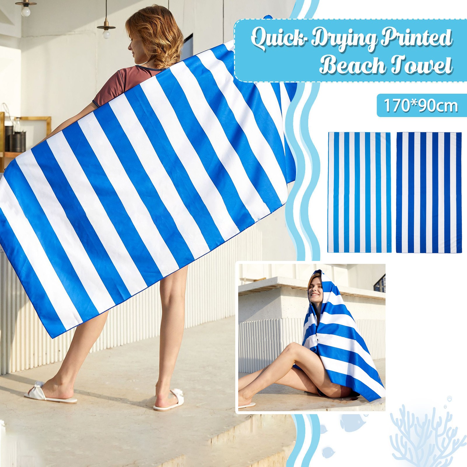 Полосатое пляжное полотенце, впитывающее и быстросохнущее портативное двустороннее флисовое полотенце