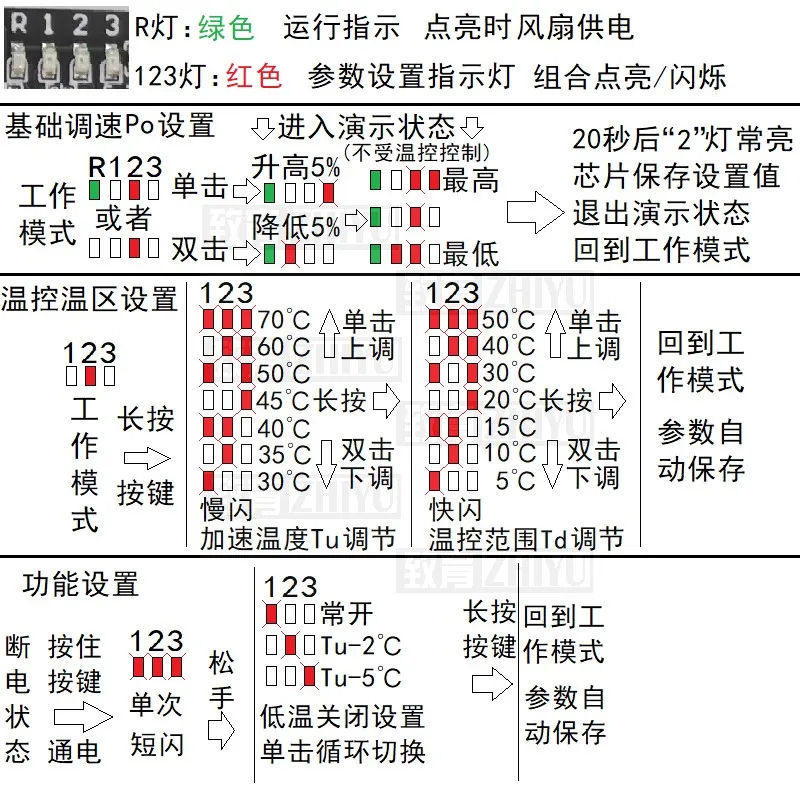 Factory default settings:Basic speed regulation outputPo=35%,Acceleration temperatureTu=30℃,Temperature control rangeTd=5℃(35℃Full speed),The fan does not stop at low temperature。