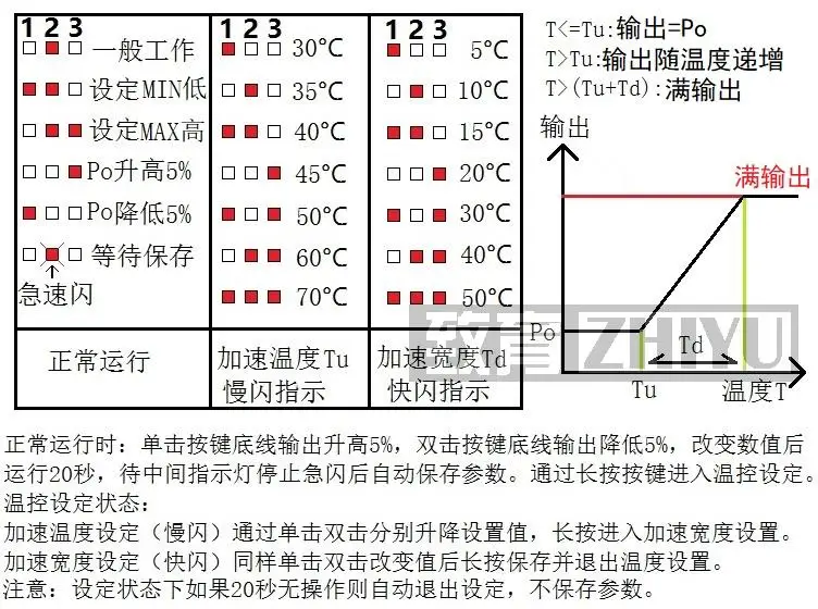 2. После установки температурного зонда скорость ручного регулирования скорости составляет начальную низкую скорость (базовая скорость), когда температура превышает температуру ускорения, скорость вентилятора ускоряется плавно с увеличением температуры, когда температура достигает или превышает сумму ускорения температуры и ускорения Ширина (это полная температура) время, полная скорость вентилятора. Параметры температуры ускорения и ширины ускорения показаны на следующей диаграмме настроек, на рисунке 1 2 3 номер указывает, что светильник индикатора на плате включен (красный) внешний (белый) статус отображается в бинарном порядке: