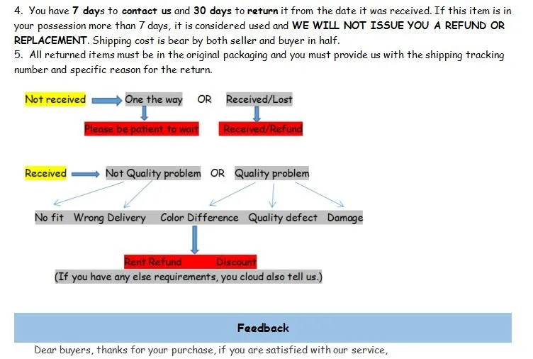 Мы предлагаем один год гарантии на продукт. Если есть какие-либо повреждения, мы вышлем вам бесплатные детали, пожалуйста, установите его (мы отправим вам Установочное видео). Но если он поврежден человеческими факторами, или если он разрушен внешними силами, вам нужно будет оплатить некоторые сборы.