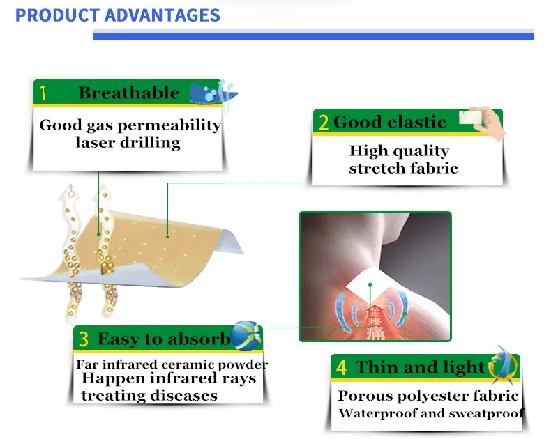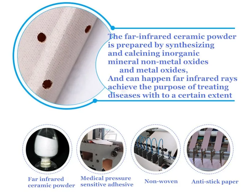 Основные ингредиенты: инфракрасный керамический порошок, медицинский чувствительный к давлению клей, Нетканая, антипригарная бумага. Керамический порошок дальнего инфракрасного диапазона готовят путем синтеза и кальцинирования Неорганических Минеральных неметаллических оксидов и оксидов металла, и могут произойти дальние инфракрасные лучи для достижения цели лечения заболеваний в определенной степени.