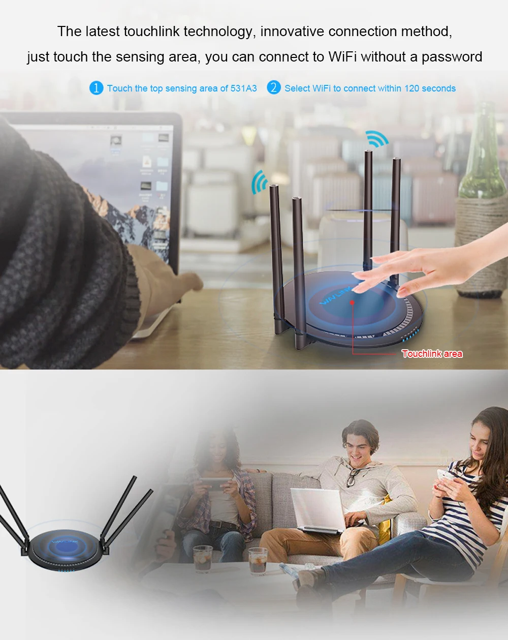 • Функция сенсорного соединения: прикоснитесь к логотипу wavlink, пользователь может подключить Wi-Fi без ввода пароль в течение двух минут, а затем бесплатный доступ к Интернету