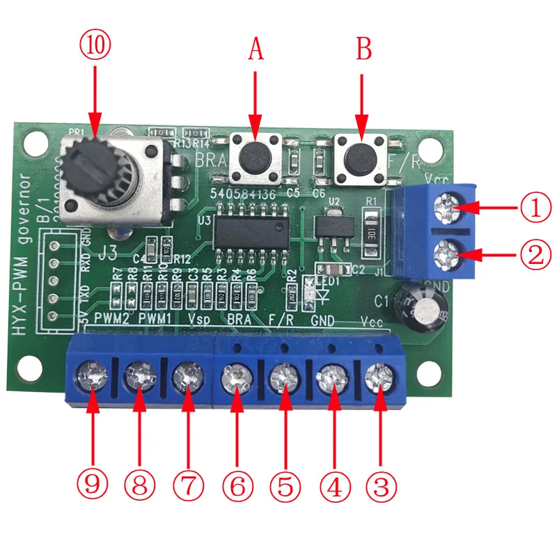 (3) Функция контроллера: он может управлять скоростью двигателя; Он может управлять вращением двигателя по часовой стрелке или против часовой стрелки; Он может управлять Мотором для немедленного торможения, но предпосылка заключается в том, что двигатель должен иметь функцию торможения.